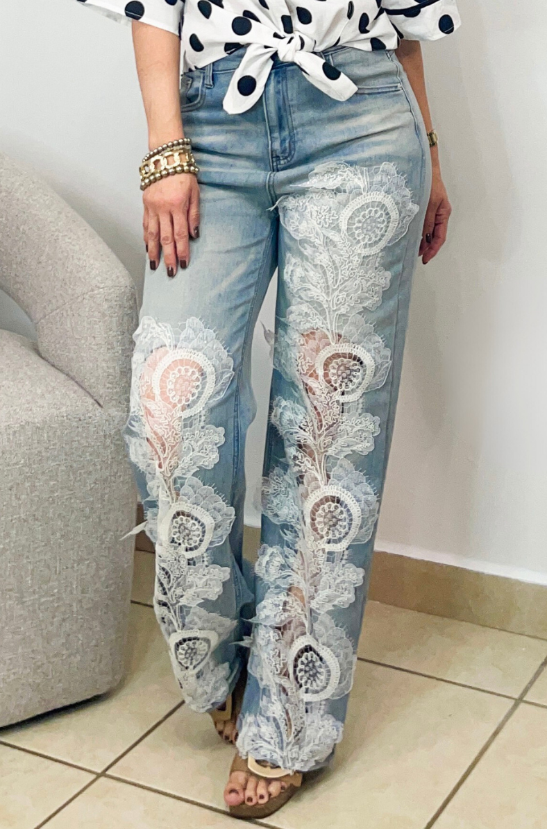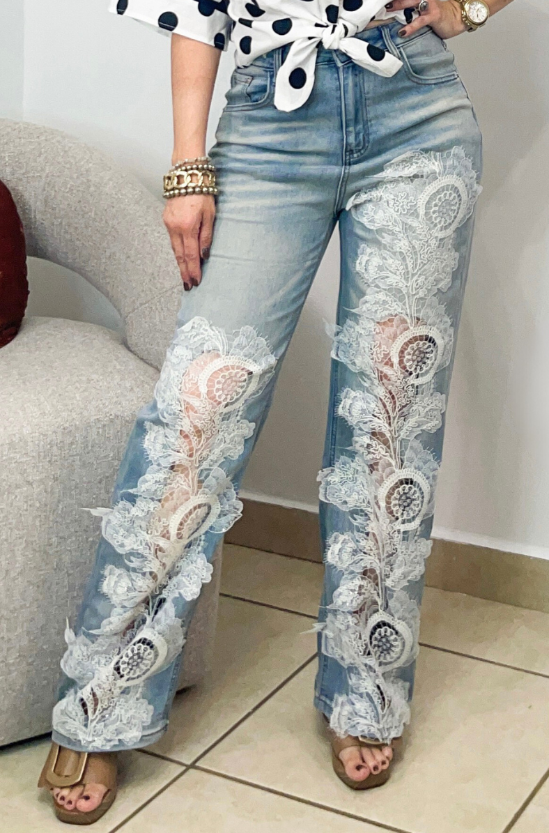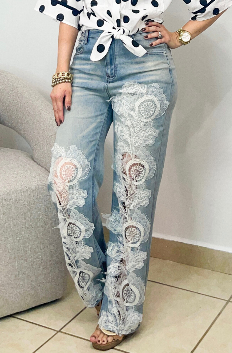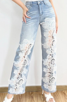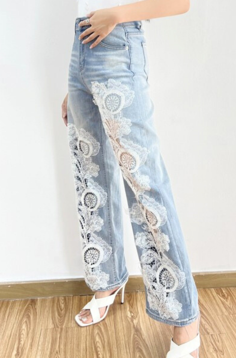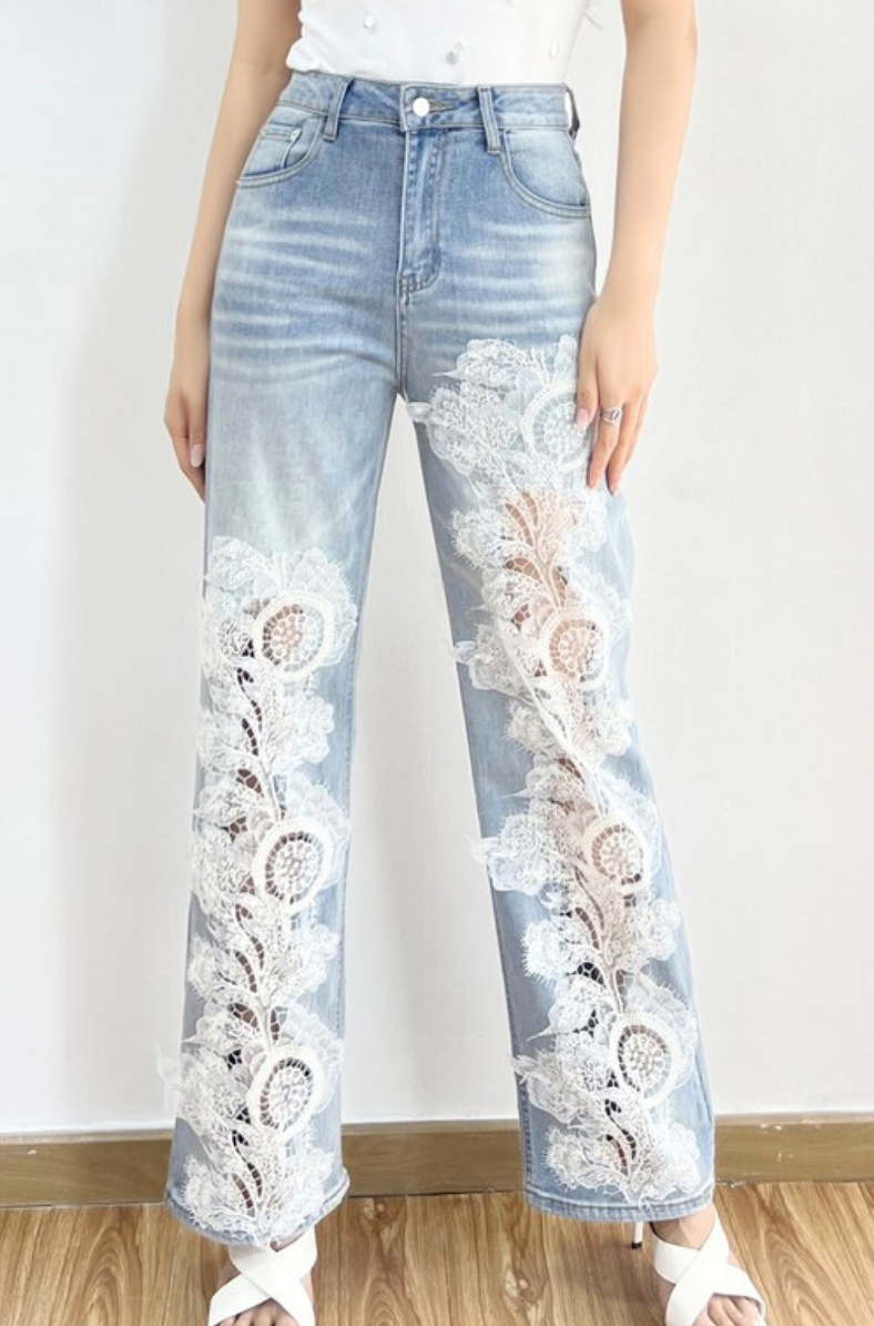 The Lace Patchwork Straight Jeans blend edgy denim with a romantic touch, featuring intricate lace inserts along the legs. Their straight-leg cut keeps the silhouette modern and versatile, perfect for both casual and elevated looks. Pair them with a simple blouse or a fitted top to let the lace detailing stand out beautifully. These denim features lightweight denim fabric, lace patchwork detail, high waist, straight leg silhouette, classic 5-pocket and zipper fly with button closure.