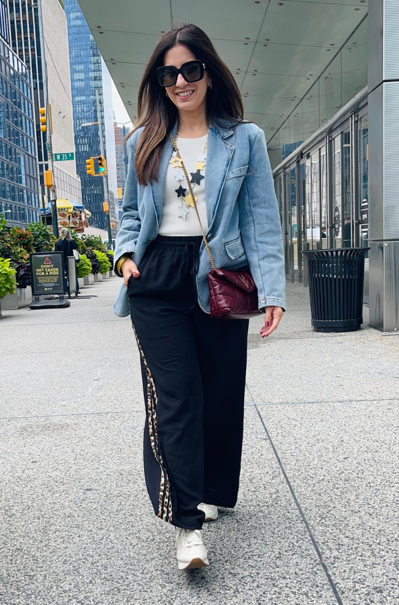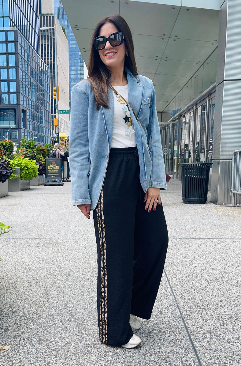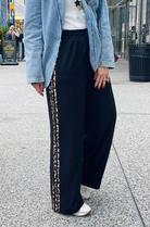 The Manhattan Stripe Trouser blends laid-back comfort with a sleek, city-chic edge. Designed with an elastic waistband and adjustable tie for a customizable fit, these wide-leg pants feature lining, practical side pockets and a bold patterned stripe down each leg for a touch of modern flair. Perfect for dressing up with heels or styling casually with sneakers, they’re the ultimate versatile statement piece.