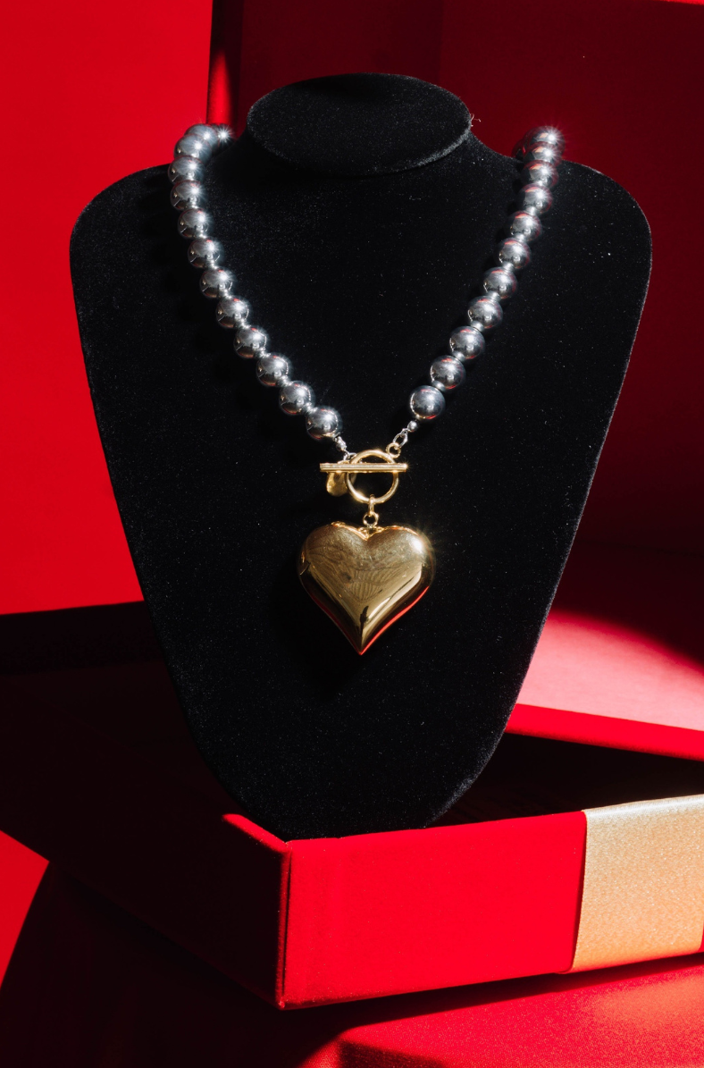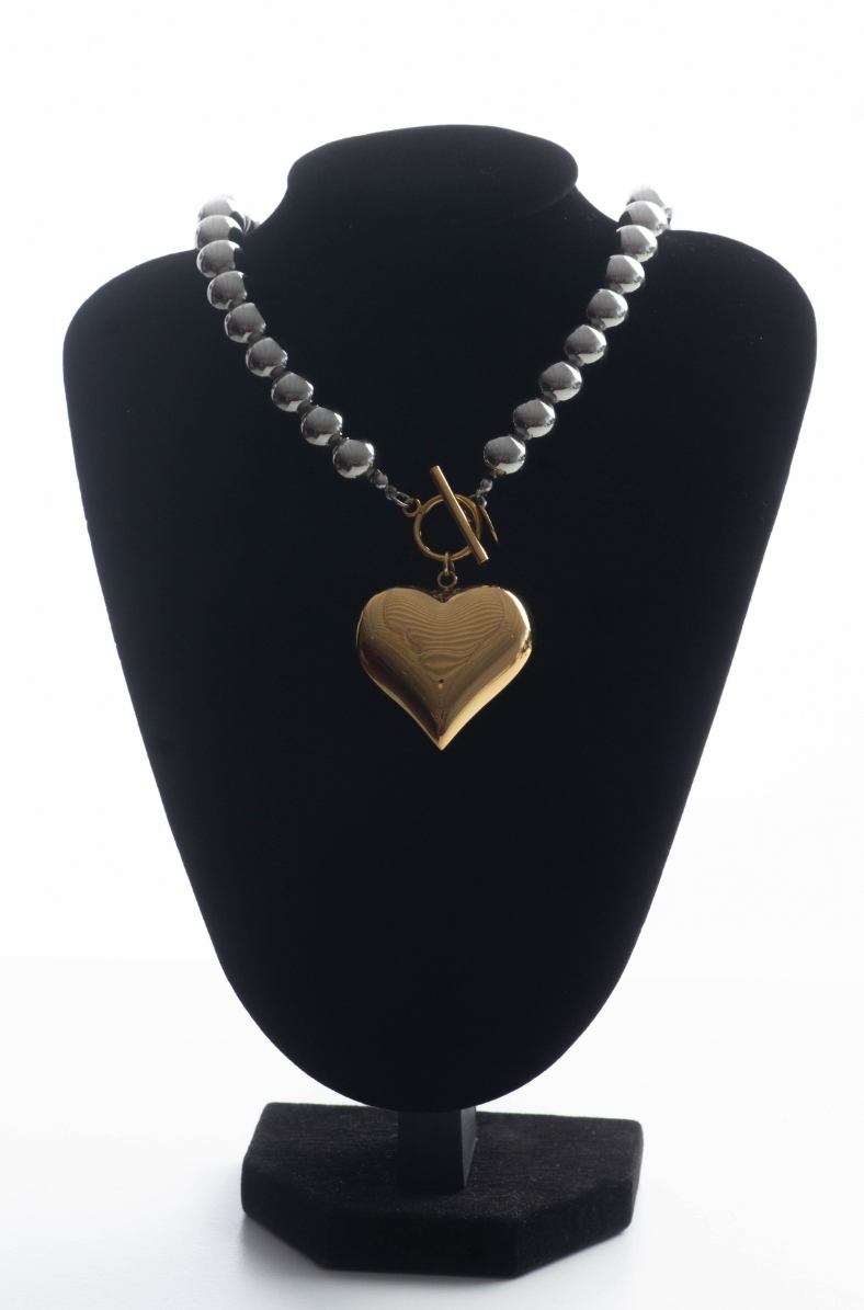 This Bold Heart Statement Necklace features a strand of highly polished silver-tone beads that create a bold, reflective, and modern look. At the center hangs an oversized gold heart pendant paired with a toggle clasp, giving it a luxe, statement-making finish. It is crafted from durable 316 stainless steel for lasting shine and strength. This 16" necklace is waterproof and hypoallergenic, ensuring comfort and resilience for everyday wear. Perfect for those seeking a stunning accessory that combines beauty with practicality.