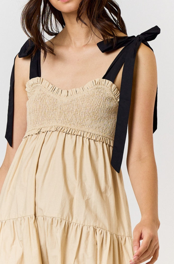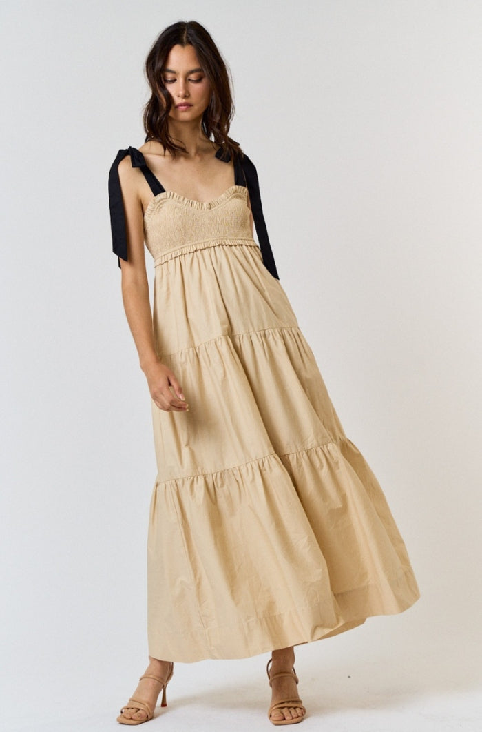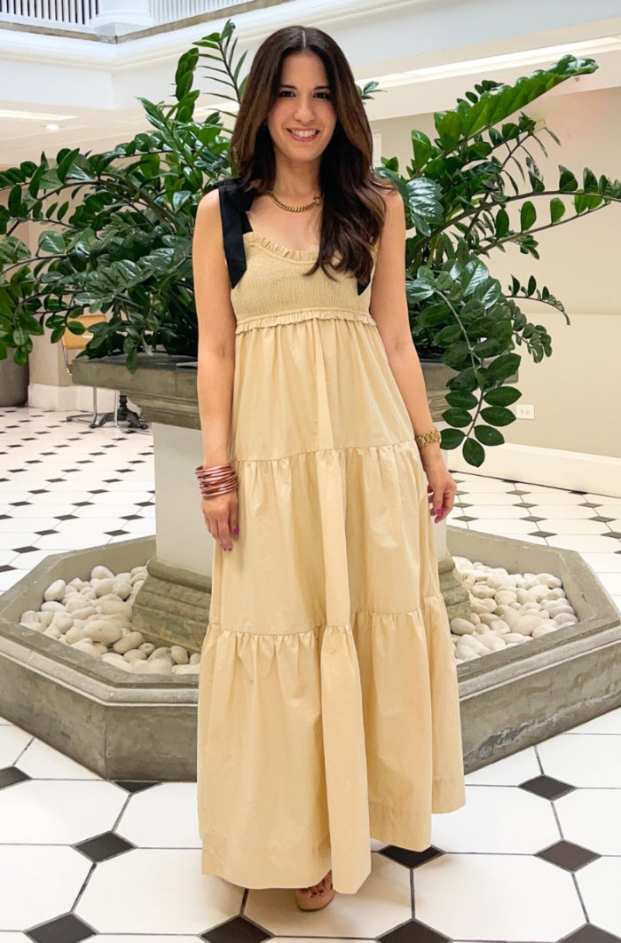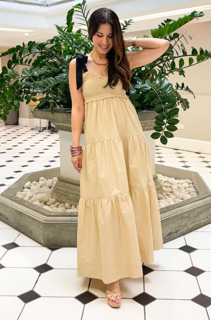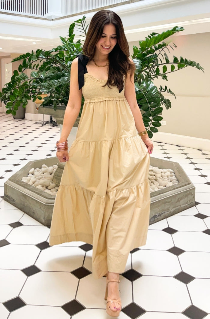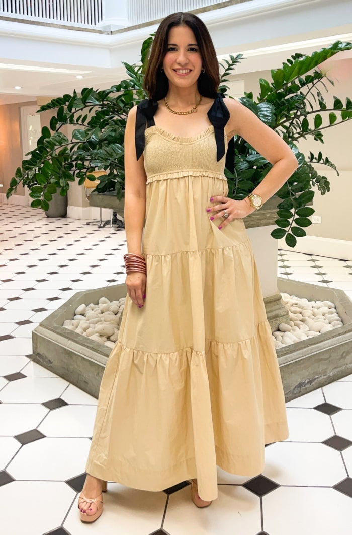 Elevate your style with our Bow Tie Maxi Dress. Designed with a sophisticated bow tie detail, this dress exudes elegance and exclusivity. Made with high-quality materials, it offers both comfort and luxury. Perfect for any special occasion, this dress will make you stand out from the crowd. This dress feature self tie straps, smocked bodice and tiered layers.
