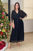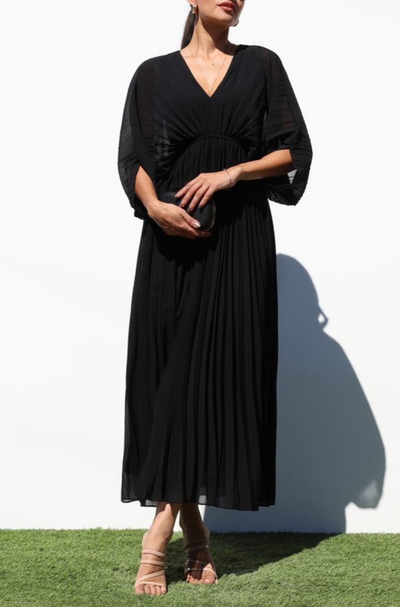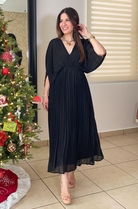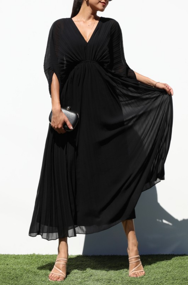 This Pleated V Neck Midi Dress is an elegant, flowy silhouette designed with a flattering V-neckline and soft, draped sleeves for effortless movement. Its finely pleated skirt adds beautiful texture and creates a graceful, airy shape that flatters every step. Timeless and versatile, this dress is perfect for special events, holiday gatherings, or any occasion where you want to feel both polished and comfortable.