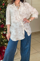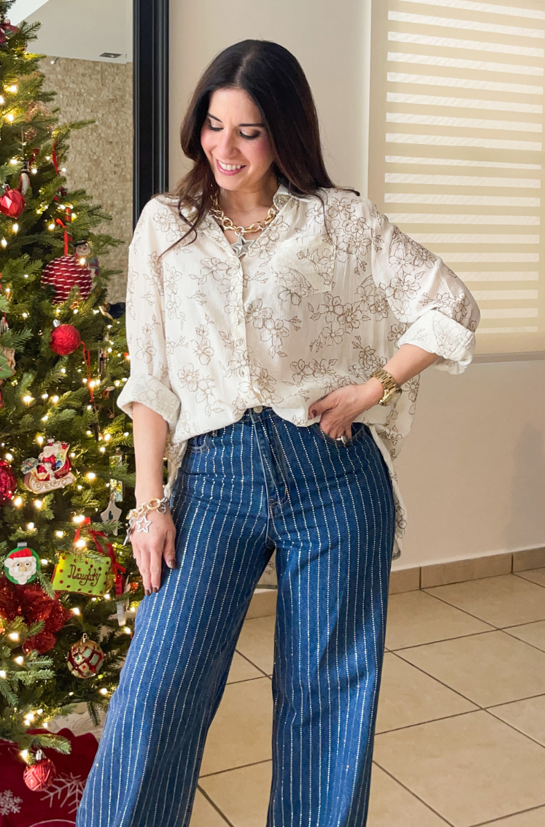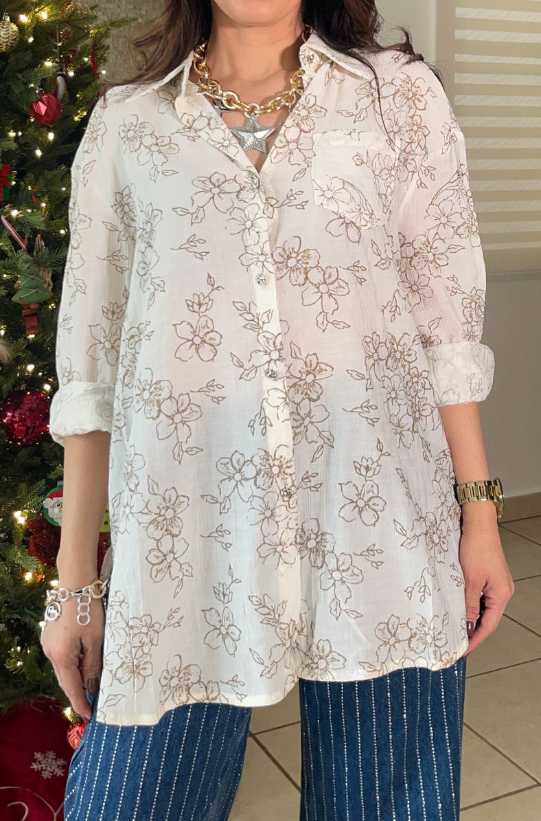 This top features long sleeves, soft sparkle / shimmer accents and floral pattern.  Also features button down style.