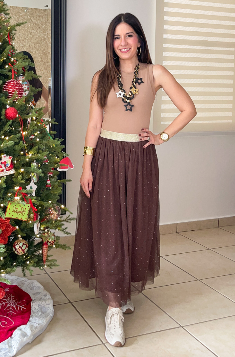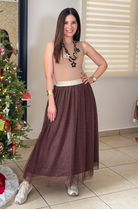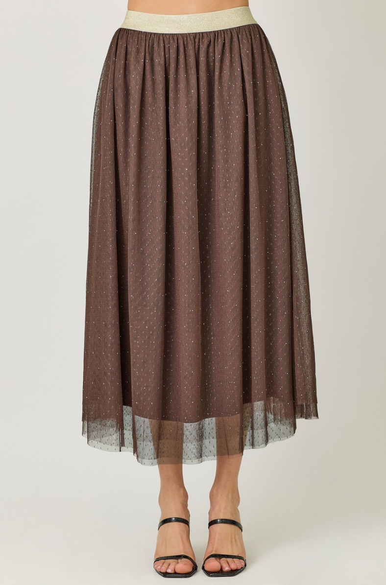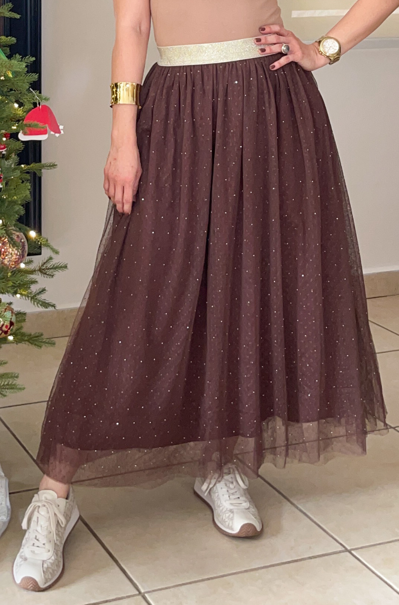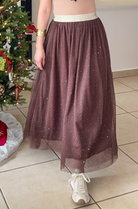 Our Sparklet Tulle Skirt is a dreamy, light-as-air piece featuring layered soft tulle with delicate sparkles throughout for a subtle, magical shimmer. Its comfortable elastic waistband and flowy midi silhouette make it effortless to style for both casual chic looks and dressier occasions. Available in chocolate and dusty pink, this skirt brings a touch of whimsy and elegance to any outfit.