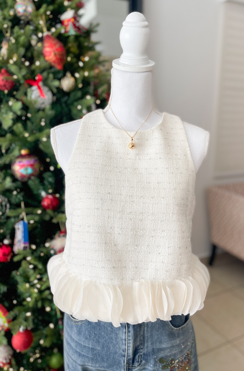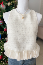 Introducing the Tweed Top with Contrast Trim. This exquisite top features a stunning texture and fabric that will elevate any outfit. With its luxurious tweed and elegant contrast trim, this top is a must-have for any fashion-forward individual. Upgrade your wardrobe with this exclusive piece. This top features crop style, back zipper, tweed fabric and contrast trim. Perfect for the Holidays and year-round.