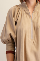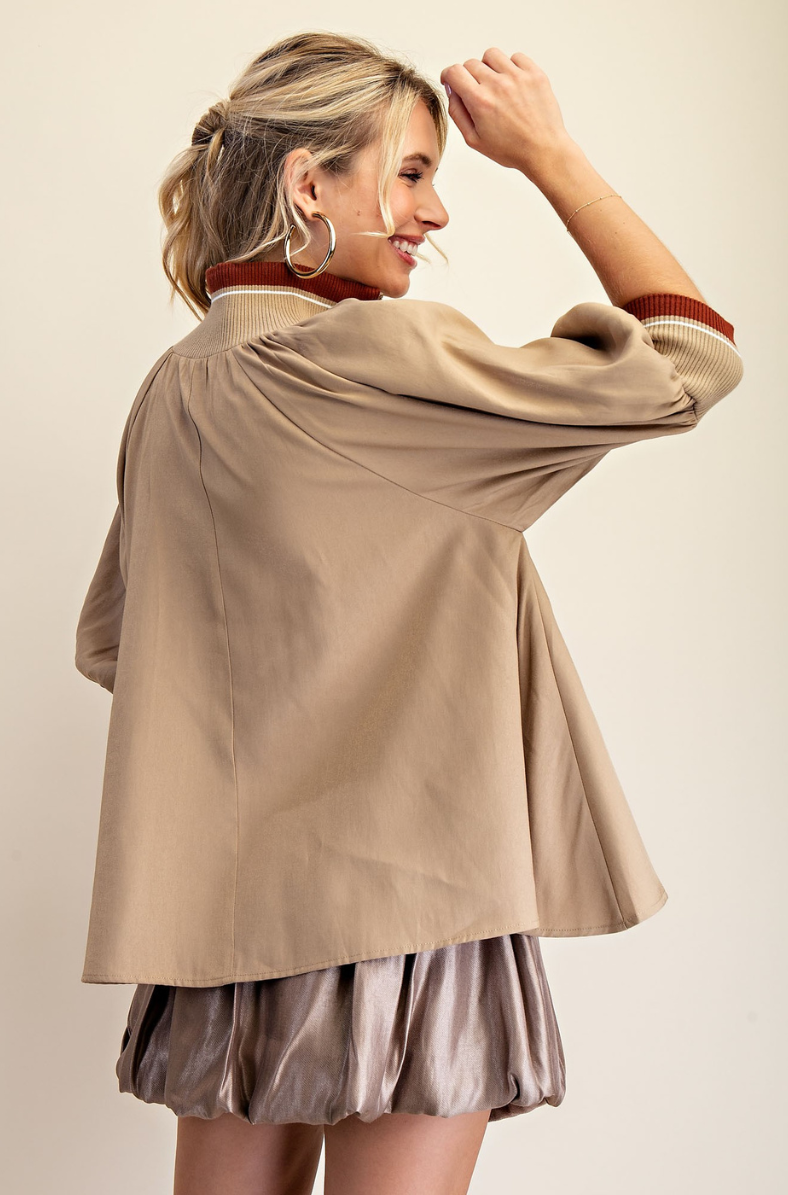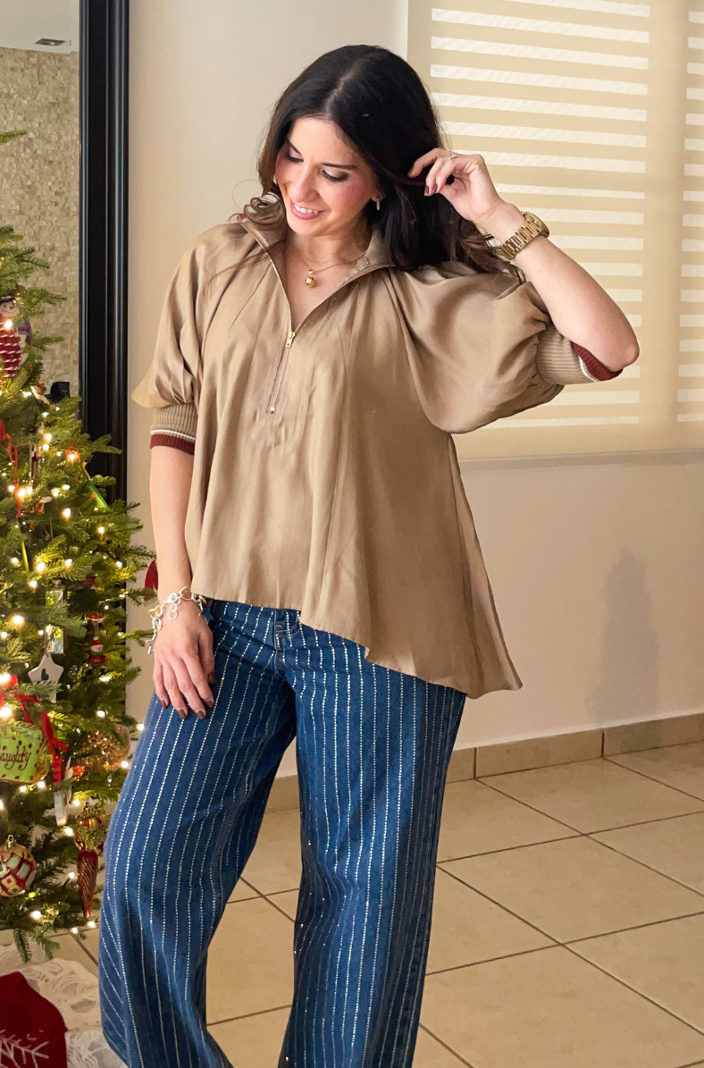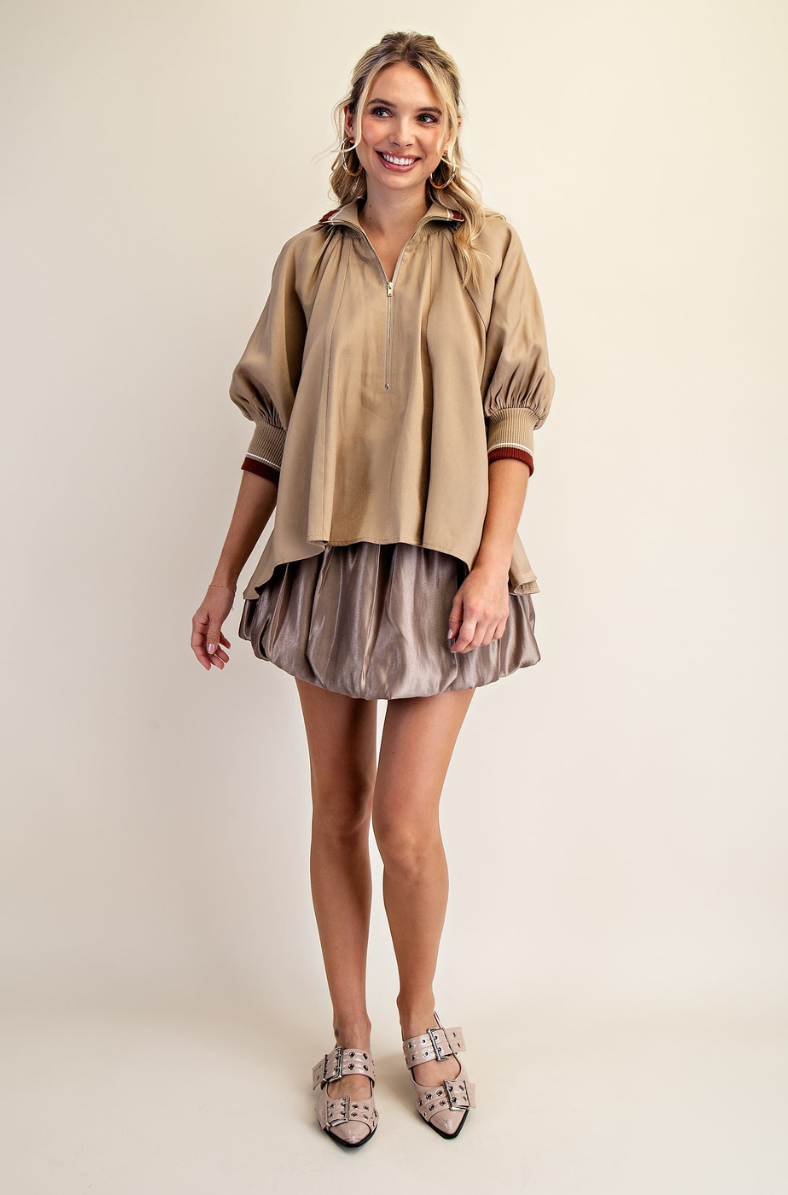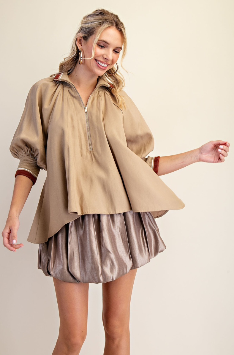 This top features mock neck style, zipper and puff sleeves.