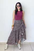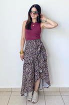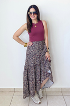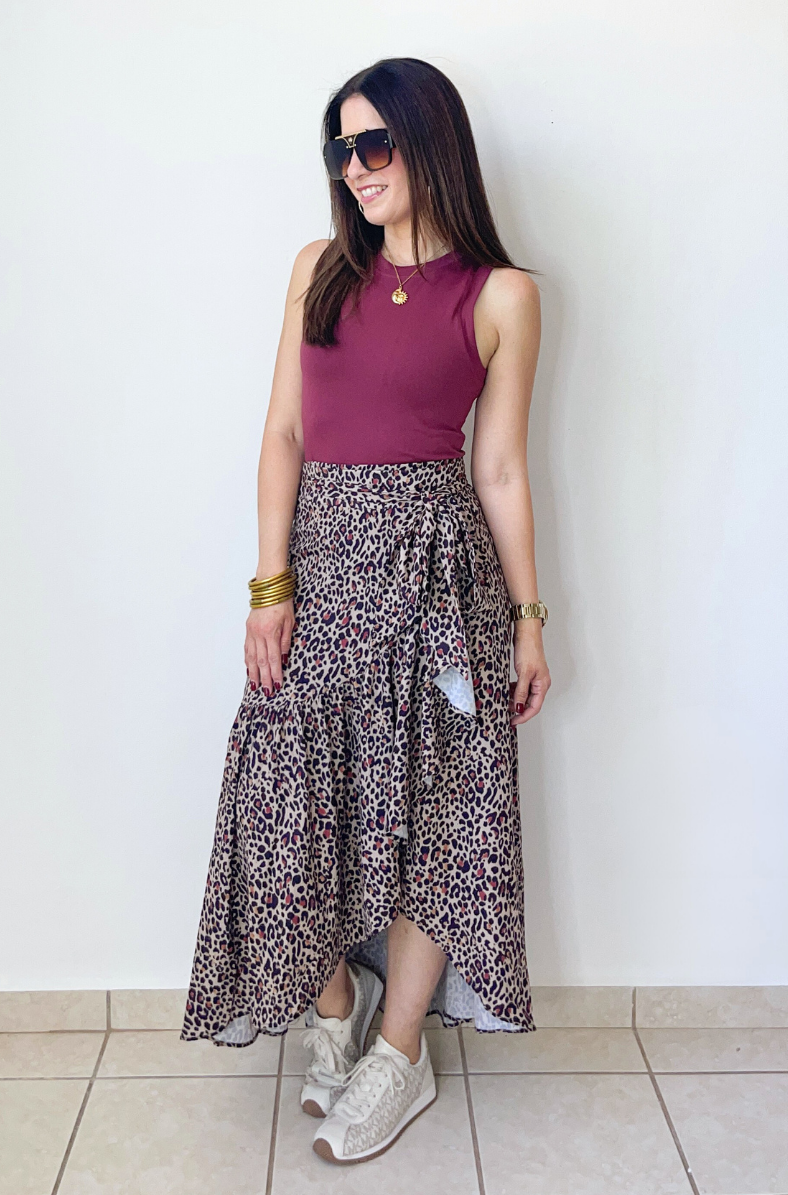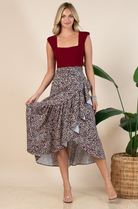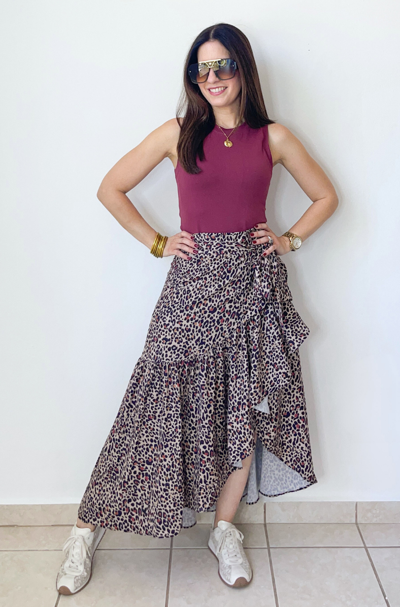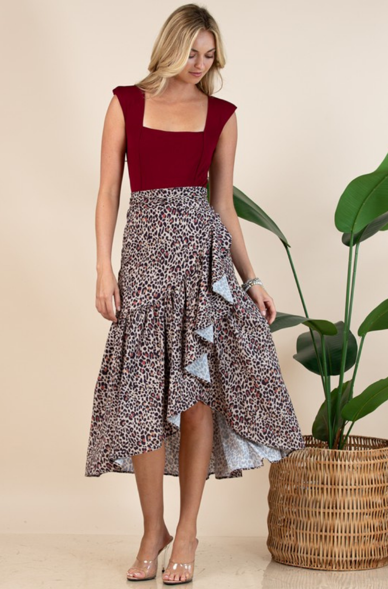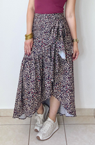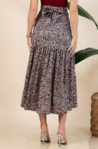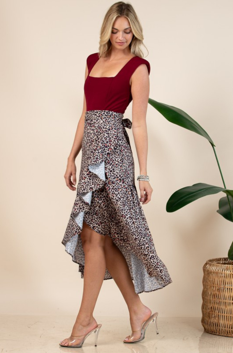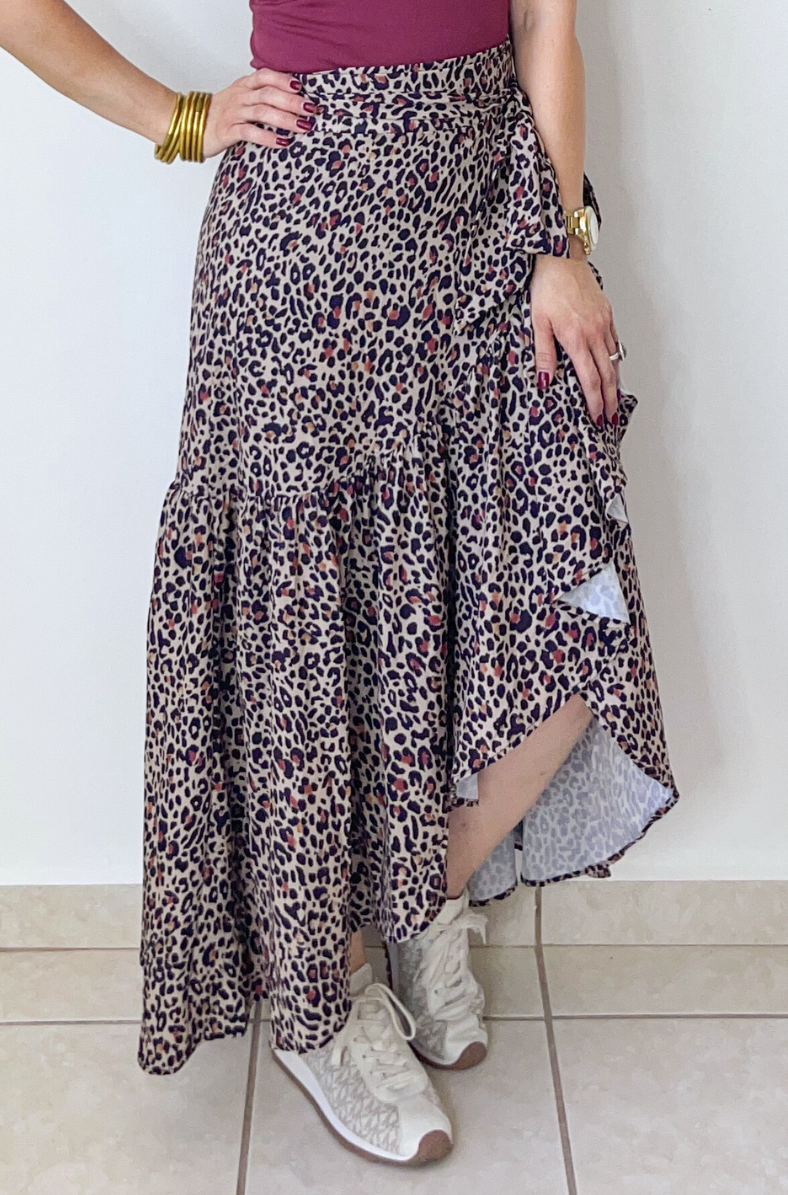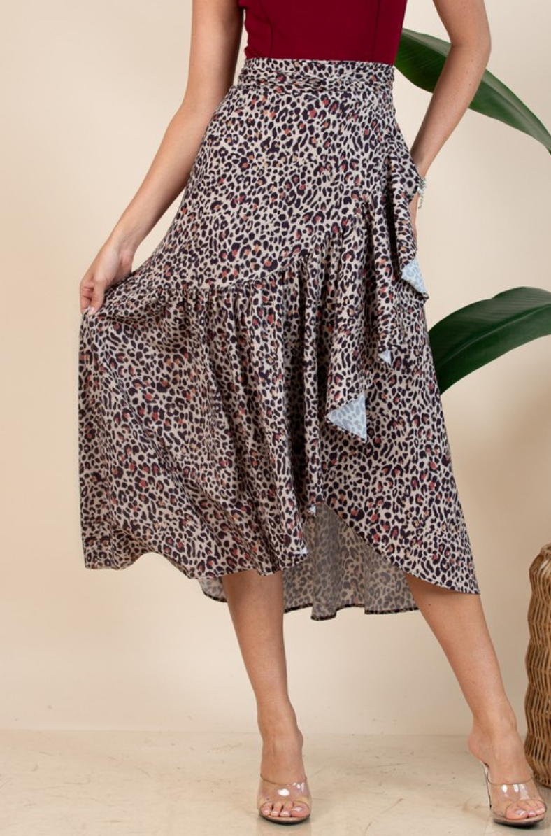 The Wrap Around Bold Animal Print Midi Skirt makes a confident statement with its fluid silhouette and eye-catching print. Designed with a flattering wrap waist that ties elegantly around, it drapes effortlessly for a feminine yet modern look. Pair it with a sleek top and heels for a night out or with sneakers for a chic daytime twist.  This midi skirt features wrap around style and whimsical ruffles.