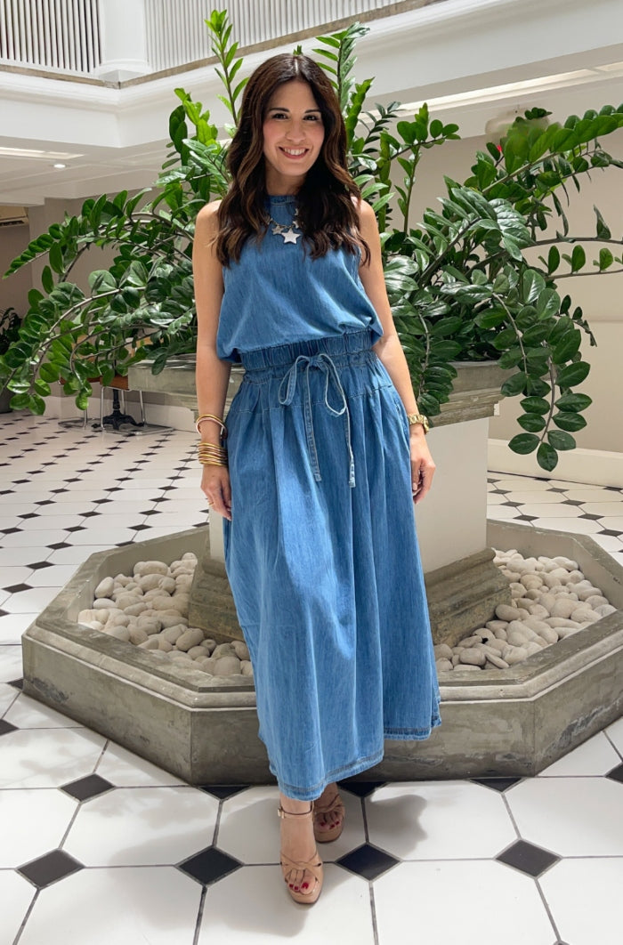 Meet your new go-to: the Denim Drawstring Dress, where casual cool meets effortless style. Crafted from soft denim, it features a back zipper, subtle elastic at the waist for gentle shape, and a drawstring tie for a customizable fit. Finished with side pockets for everyday ease, this dress is perfect for laid-back days with a polished twist.
