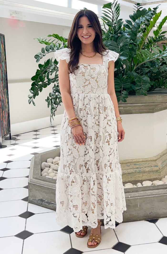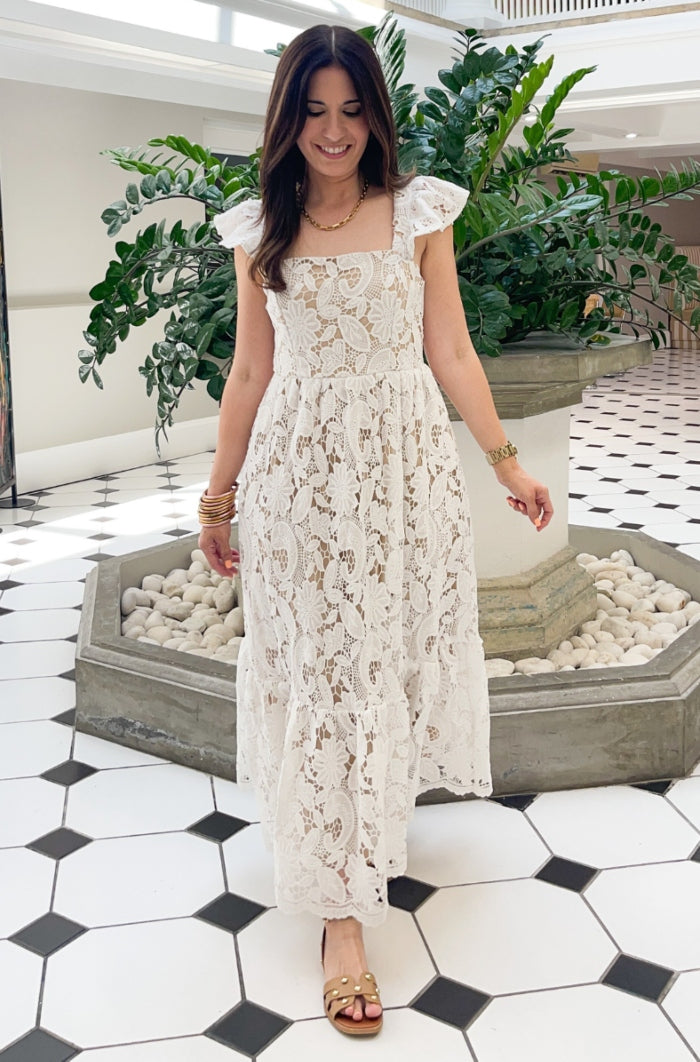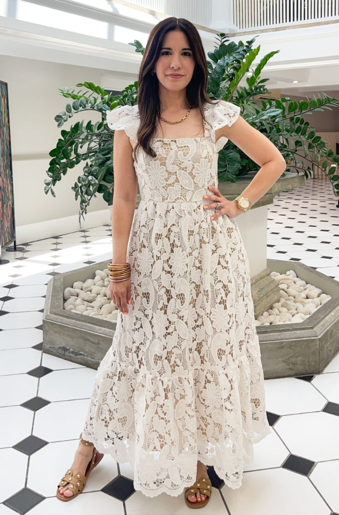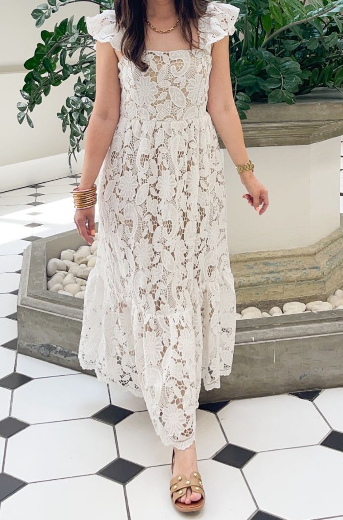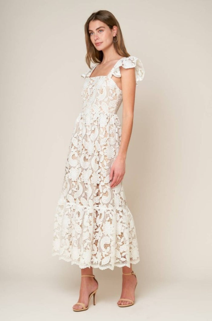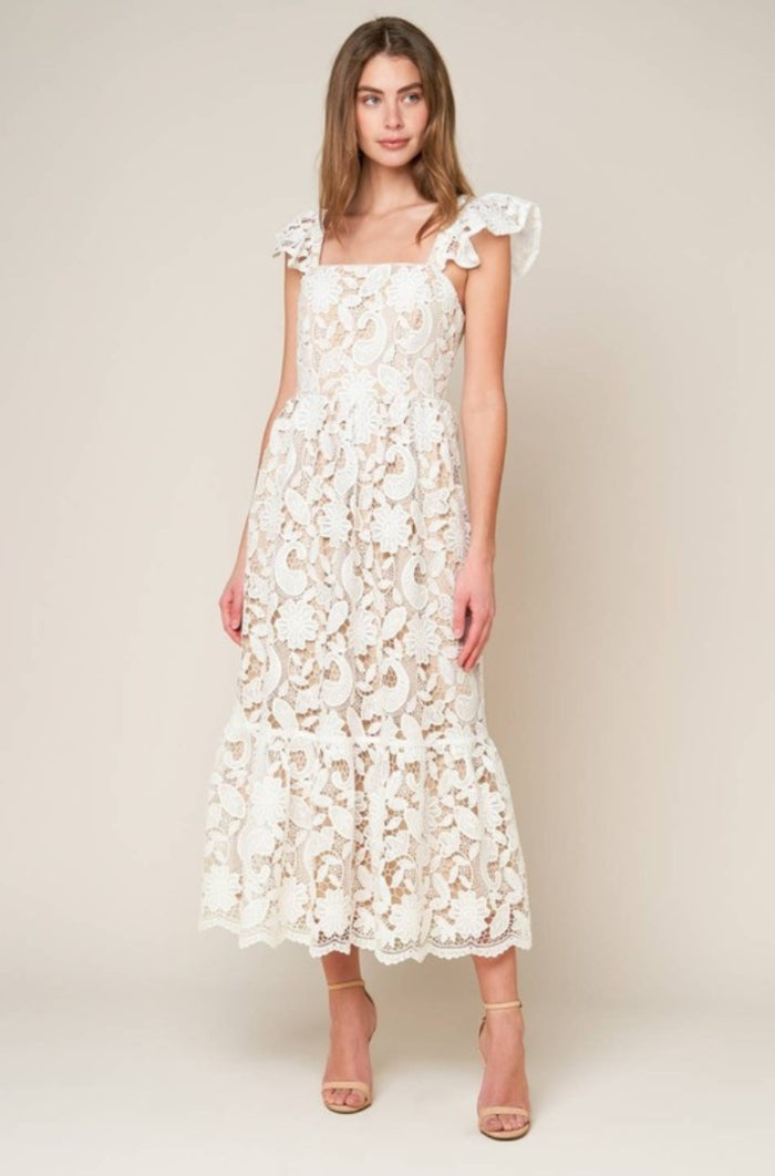 Elegant and romantic, this lace midi dress features soft ruffle sleeves and a flattering silhouette—perfect for weddings, parties, or any special occasion. This lace midi dress features short ruffle sleeves and full lining.