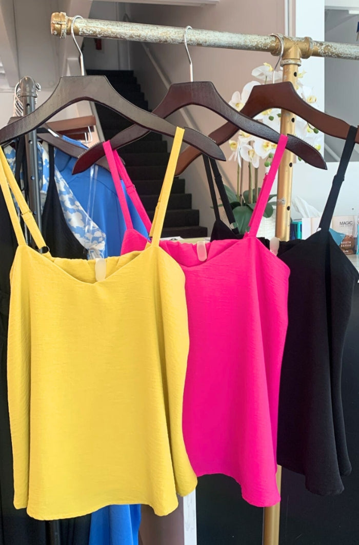 Our beloved Matte Crepe Sweetheart Cami Top is making a comeback - now in black, mustard, and an eye-catching new shade: fuchsia. Designed with a soft, textured crepe fabric, this effortlessly flowy top features adjustable straps, an elasticized back, and a flattering sweetheart neckline for a perfect, feminine fit. Fully lined and endlessly versatile, it’s a must-have staple for both everyday wear and elevated looks.