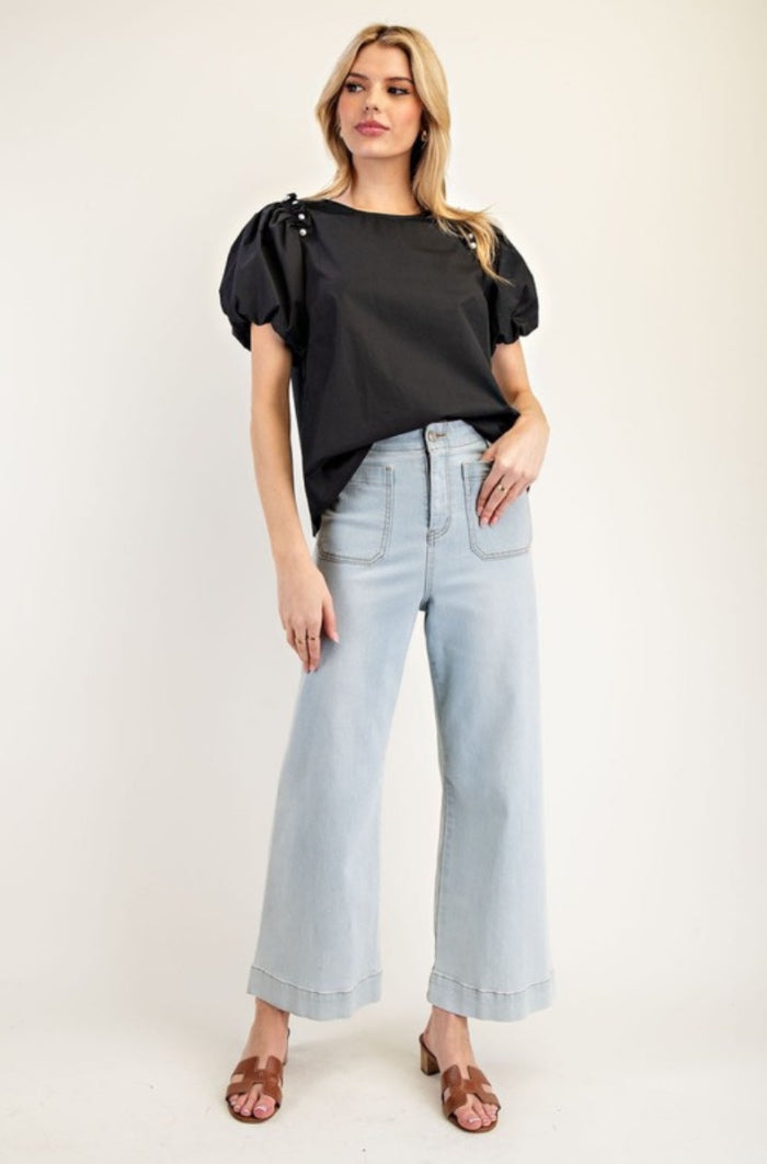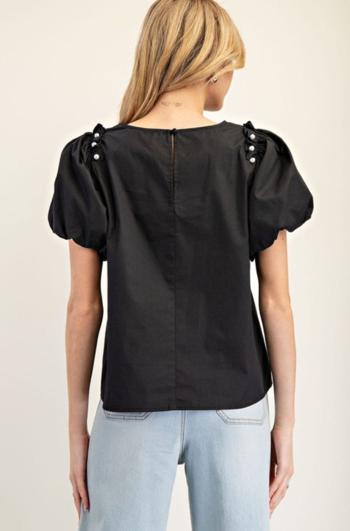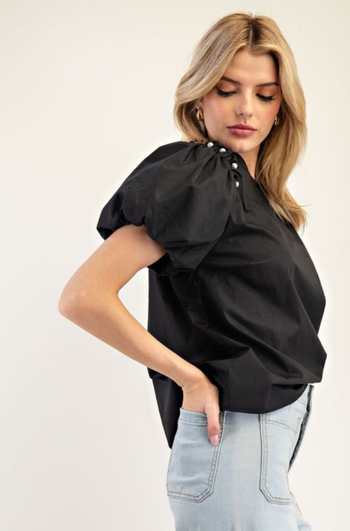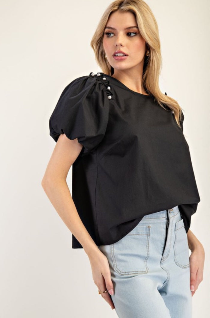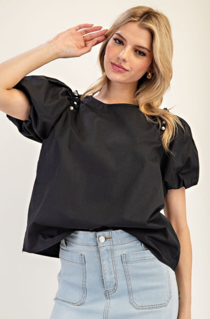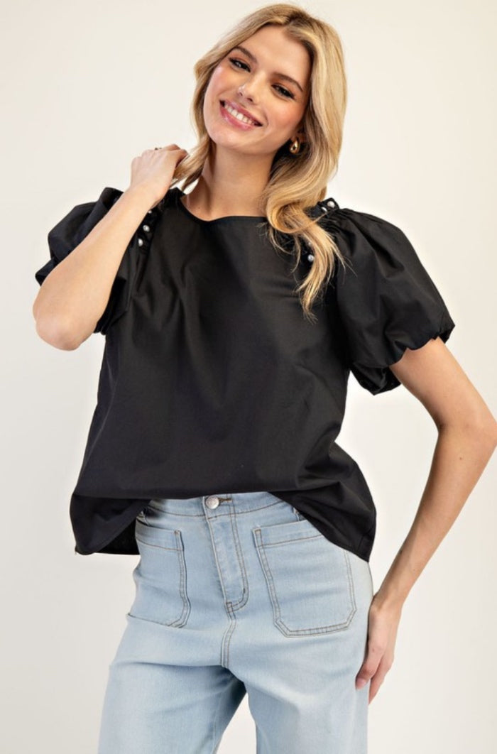 Introducing the NEW Pearl Detailed Puff Sleeve Top. Elevate your style with this elegant top featuring intricate pearl detailing on the classic puff sleeves. The perfect addition to any wardrobe, this top is sure to make a statement and add a touch of sophistication to any outfit. This top features classic round neckline, puff sleeves with delicate, pearl accents, a button and loop closure at the back.