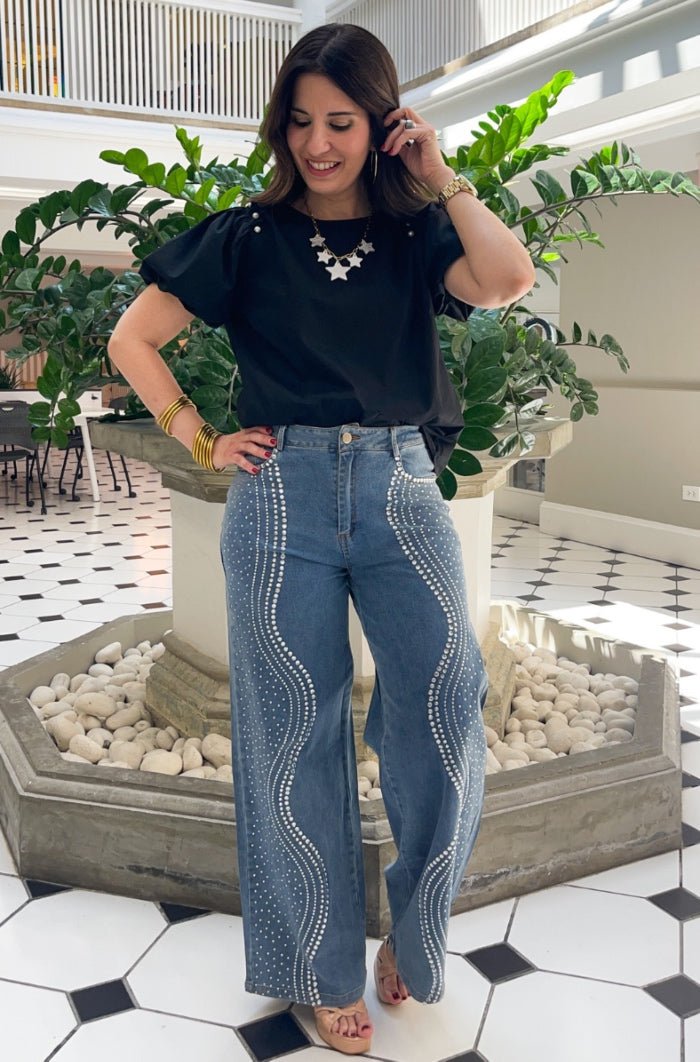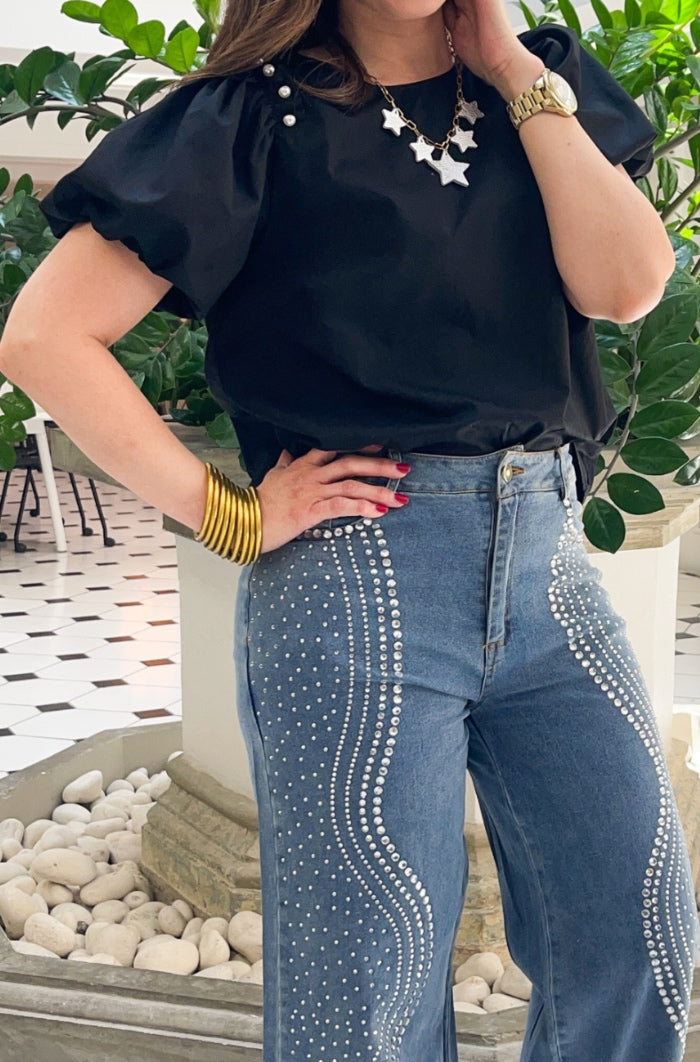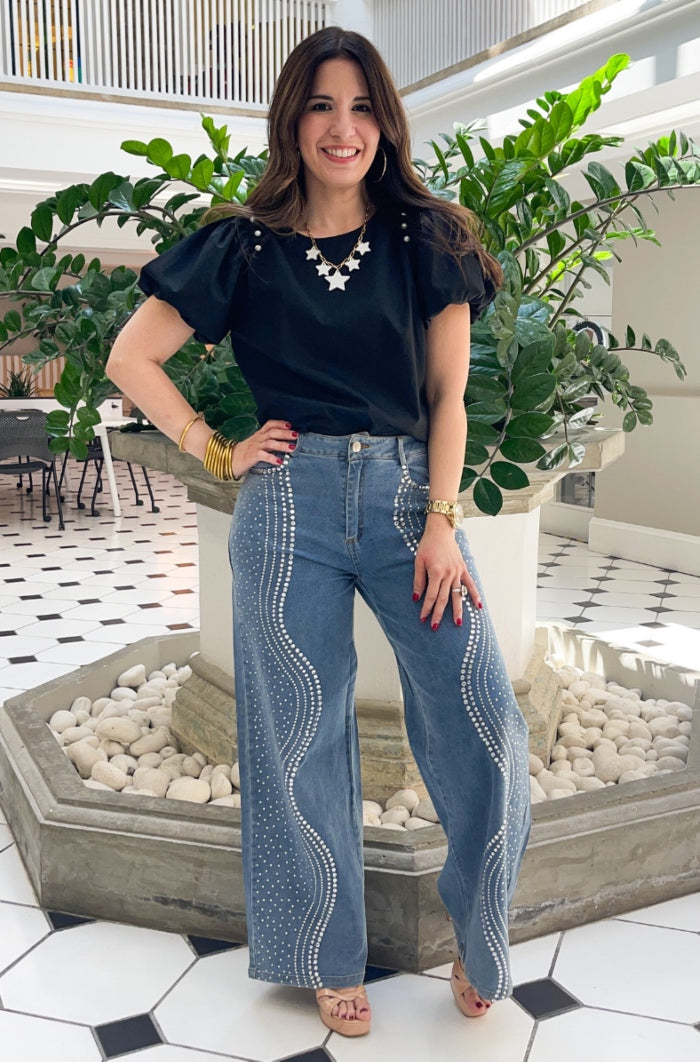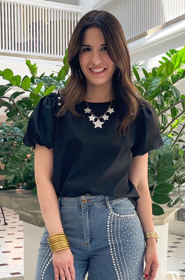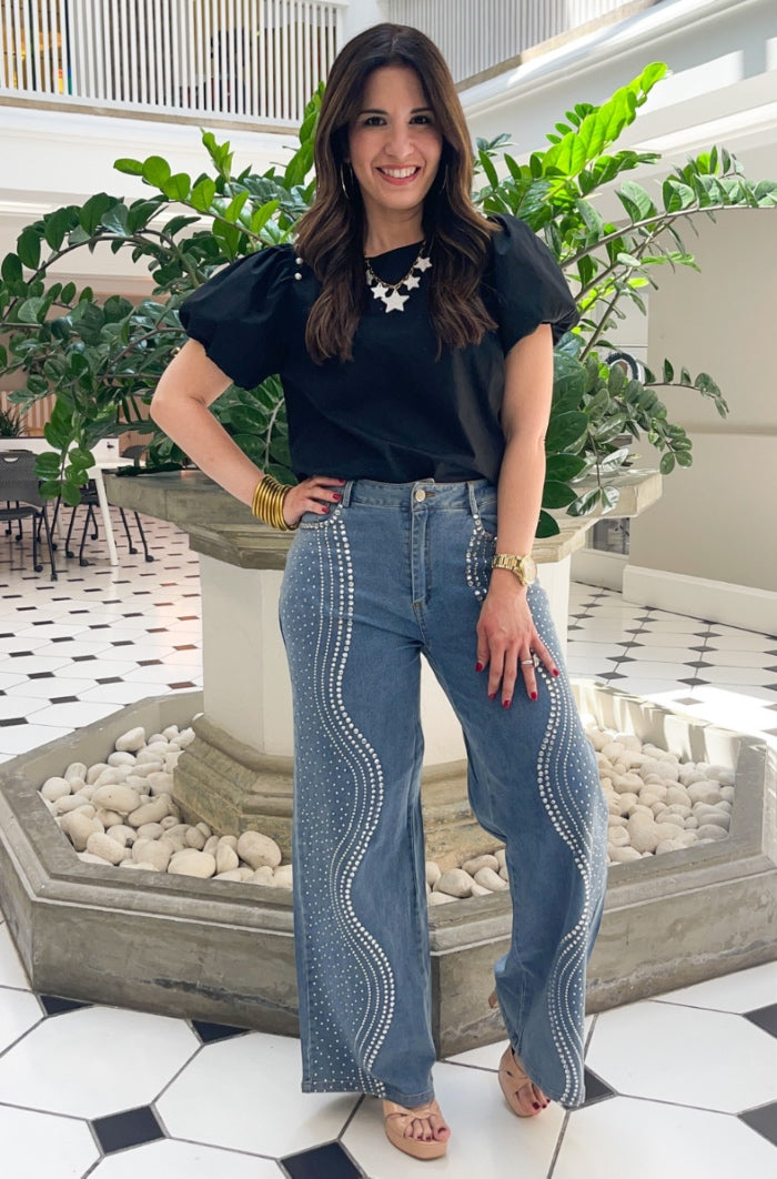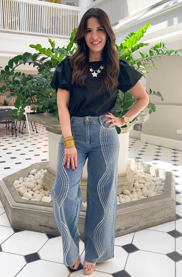 Introducing the NEW Pearl Detailed Puff Sleeve Top. Elevate your style with this elegant top featuring intricate pearl detailing on the classic puff sleeves. The perfect addition to any wardrobe, this top is sure to make a statement and add a touch of sophistication to any outfit. This top features classic round neckline, puff sleeves with delicate, pearl accents, a button and loop closure at the back.