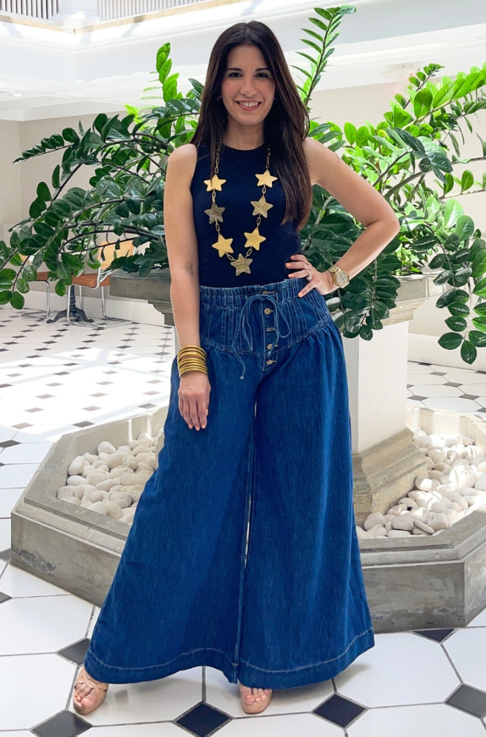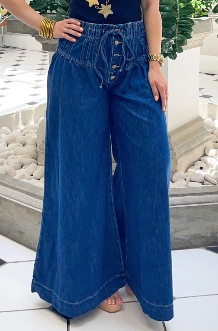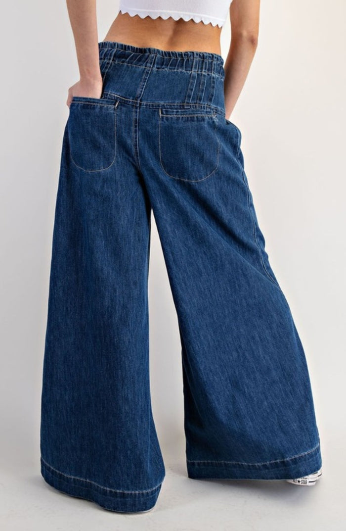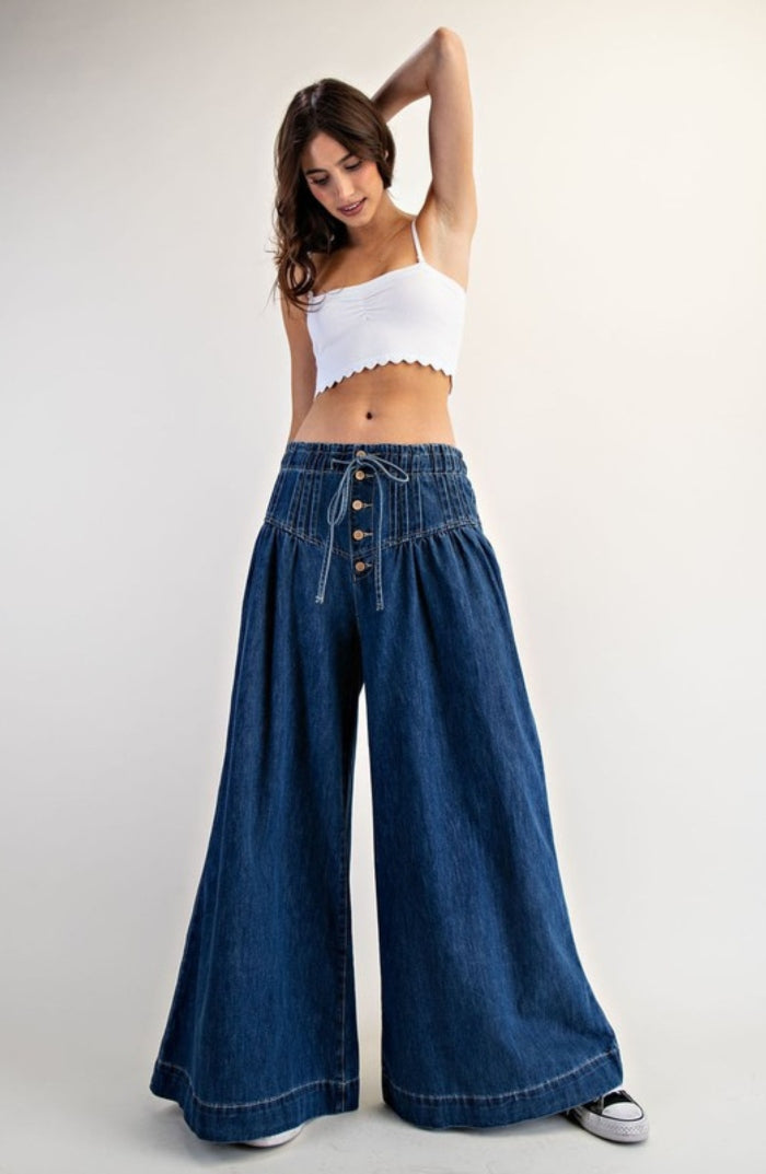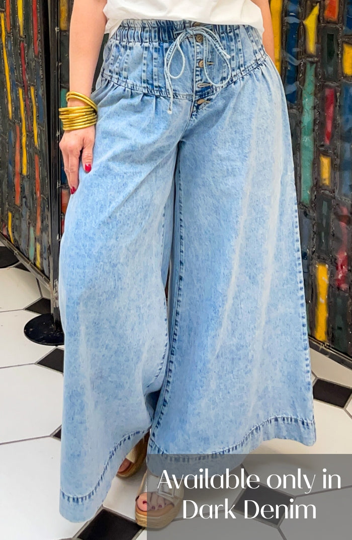 This Best Seller is back! Now in Dark Denim! Our "Pleated Wide Leg Denim Pants" - is the perfect style for adding some flare to your wardrobe! These stylish pants feature pleated details and a wide leg design, creating a unique and trendy look. Upgrade your denim game with these new arrivals! These denim pants feature high rise elastic waistband with a drawstring tie, a button up front closure, contrasting waist pleats for added detail, two side hip pockets and oversized patch pockets at the back.