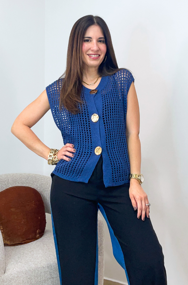 The Gold Metal Button Sweater Vest Top is a chic layering piece featuring oversized gold-tone buttons that add a touch of elegance. Its open-knit design gives it a breezy, modern look, and the true color is a darker blue than it appears in the pictures, making it even more versatile and rich in tone. Perfect over a tee or styled alone, this vest brings effortless sophistication to both casual and smart-casual outfits.