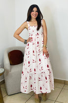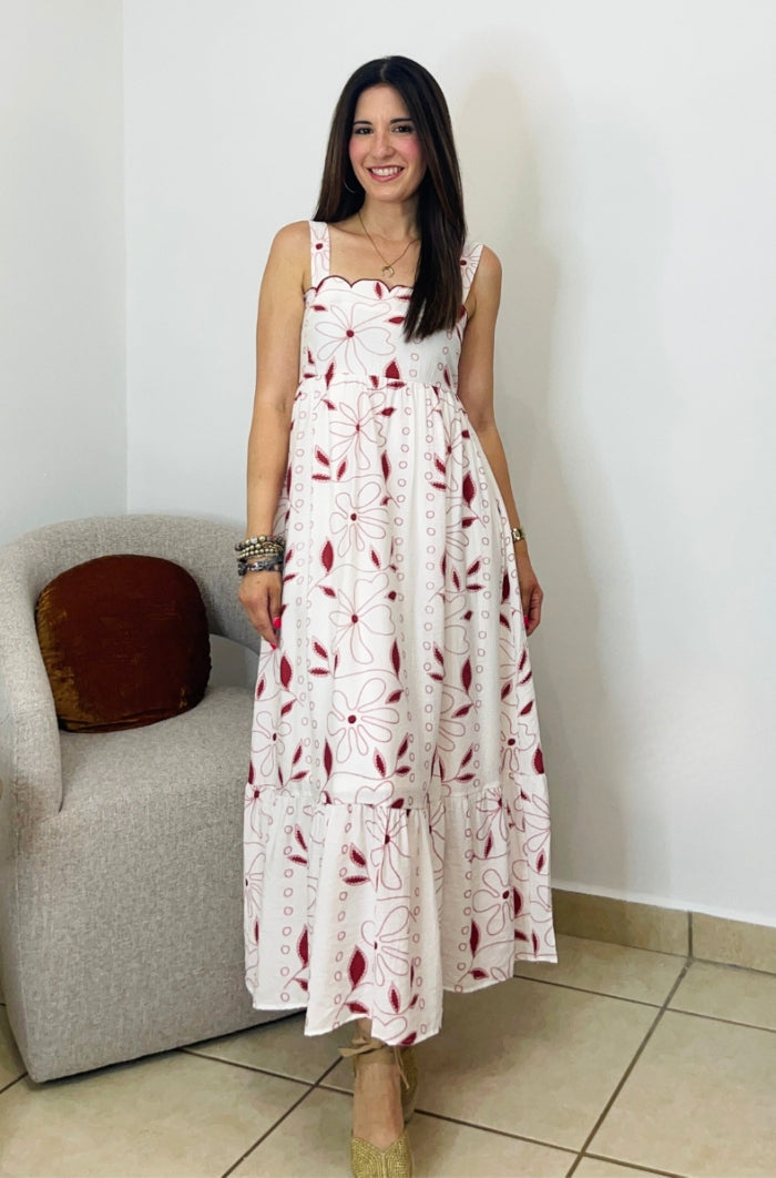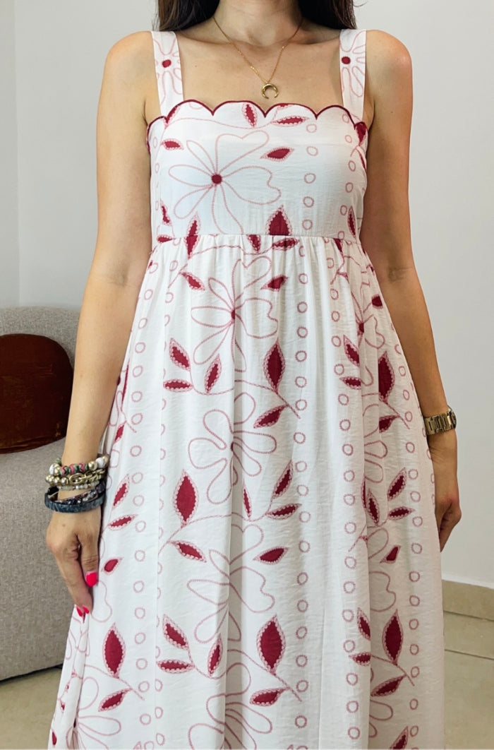 The Floral Embroidery Scallop Midi Dress is a feminine statement piece designed with delicate scallop edging and bold embroidered florals. Its flattering midi length and flowy silhouette make it perfect for both casual outings and special occasions. Effortlessly chic, this dress combines timeless elegance with playful charm. This midi dress features adjustable straps, embroidery details, smocked back and lining.