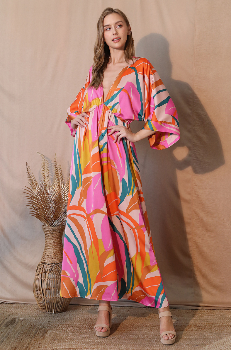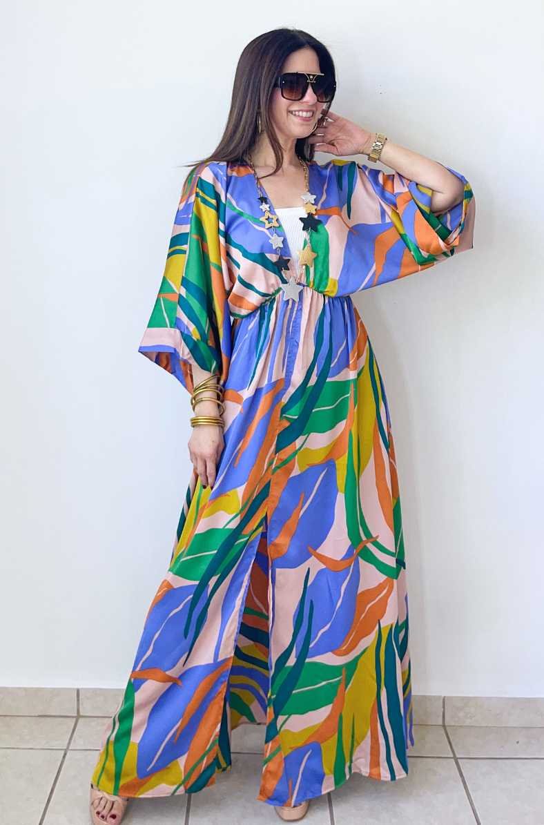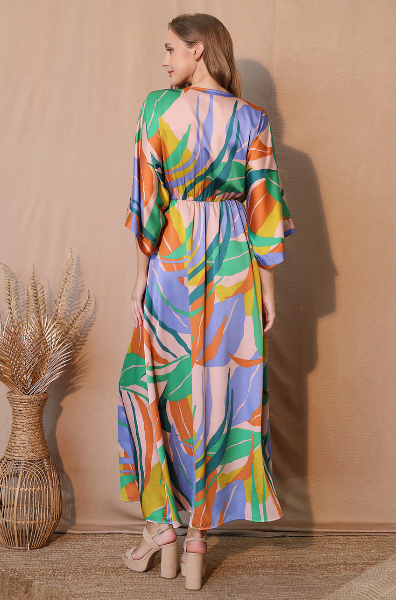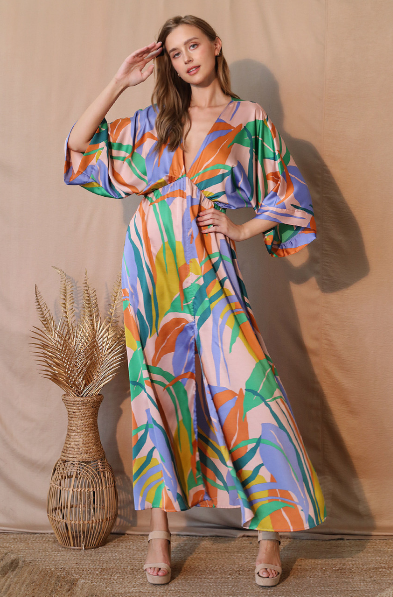 The Palma Satin Kimono Maxi Dress is a stunning statement piece that combines effortless elegance with vibrant flair. Crafted from fluid satin, it features a relaxed kimono silhouette with wide sleeves, a deep V-neckline, and a cinched waist that flatters every figure. Available in two bold colorways, this dress moves beautifully with you—perfect for resort getaways, sunset dinners, or any moment that calls for standout sophistication.