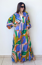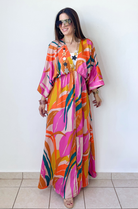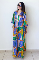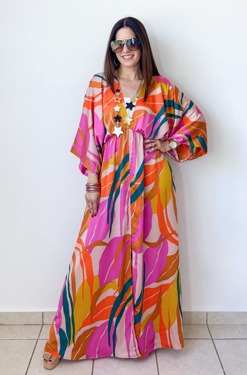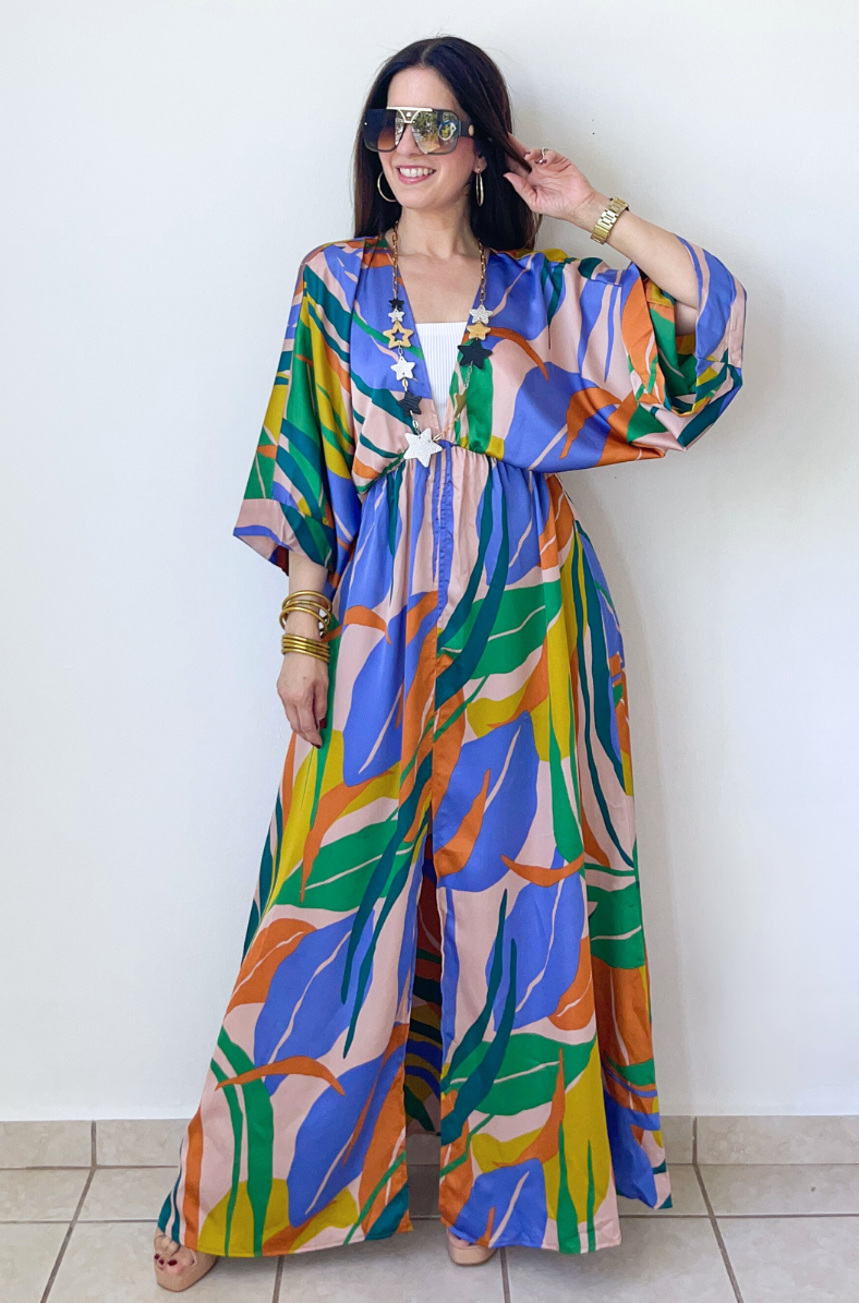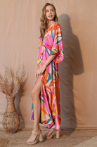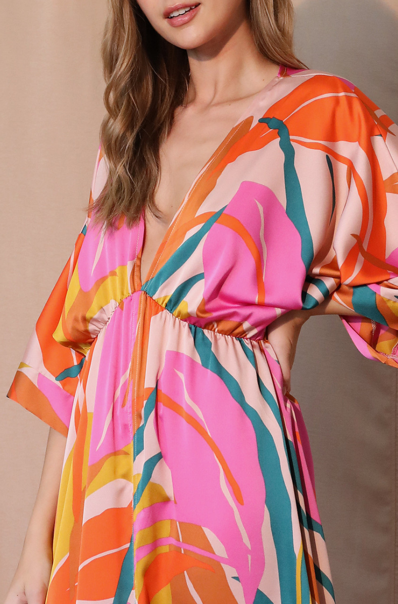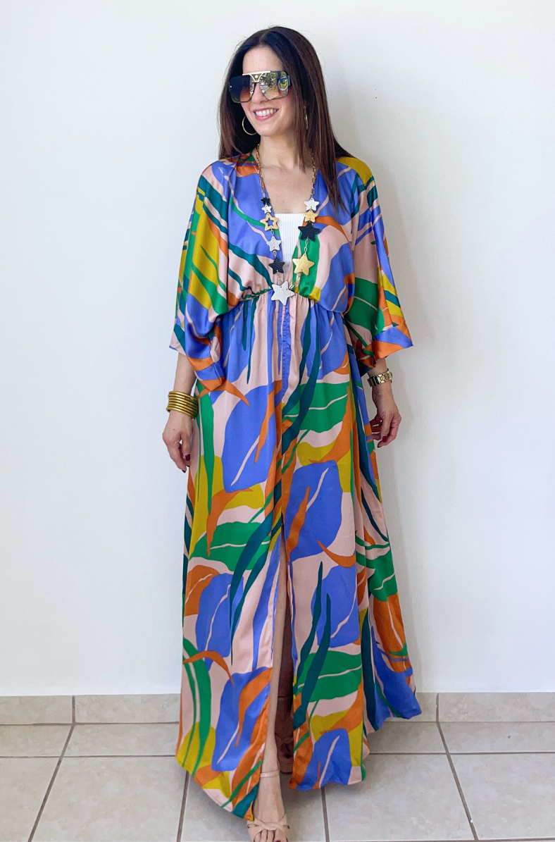 The Palma Satin Kimono Maxi Dress is a stunning statement piece that combines effortless elegance with vibrant flair. Crafted from fluid satin, it features a relaxed kimono silhouette with wide sleeves, a deep V-neckline, and a cinched waist that flatters every figure. Available in two bold colorways, this dress moves beautifully with you—perfect for resort getaways, sunset dinners, or any moment that calls for standout sophistication.