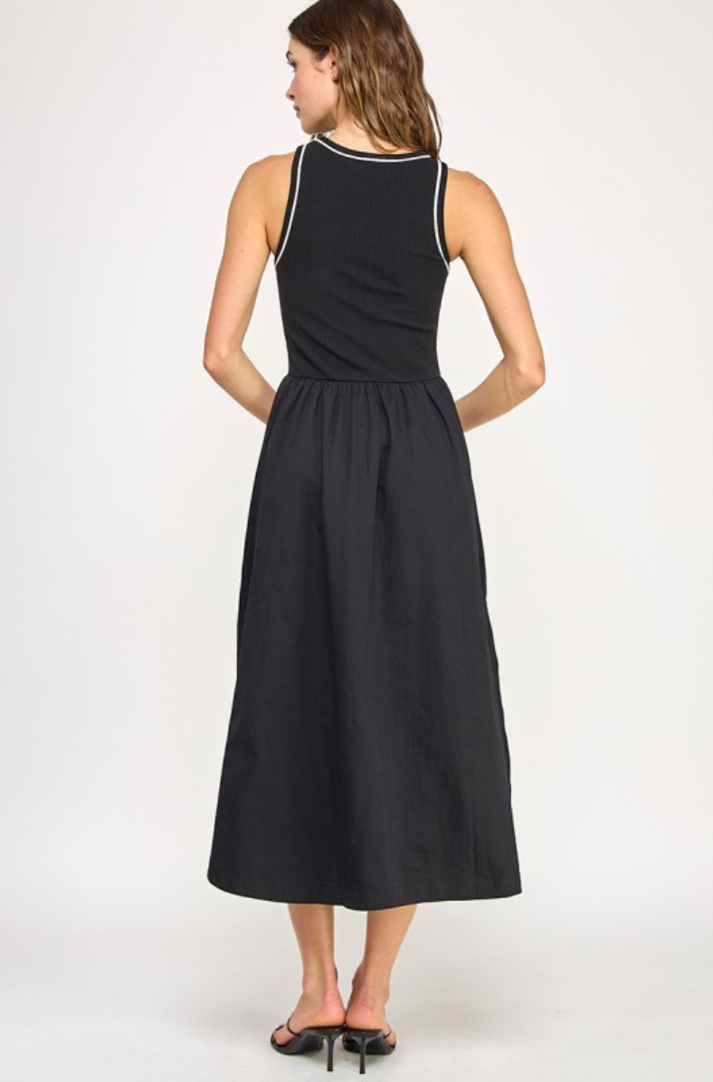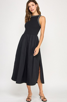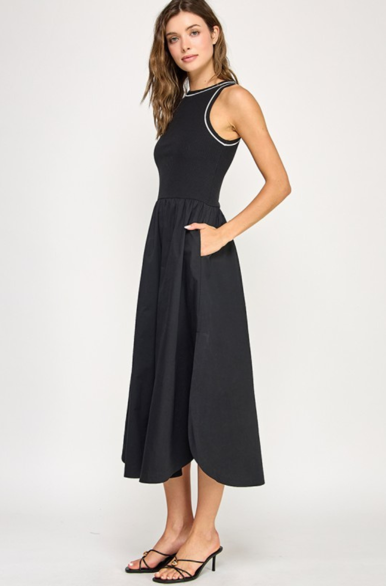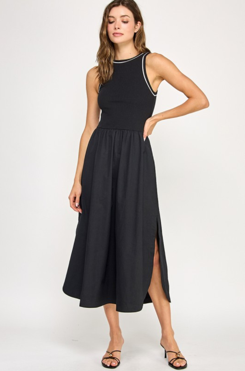 The Sleeveless Mix Media Dress blends a ribbed knit bodice with a flowy woven skirt for a flattering, textural contrast. Its fitted top, gathered waist, and mid-length skirt with side slit create an effortlessly chic silhouette. Perfect for day-to-night dressing, this versatile piece pairs easily with heels, sandals, or sneakers.  If features side slit and side pockets.