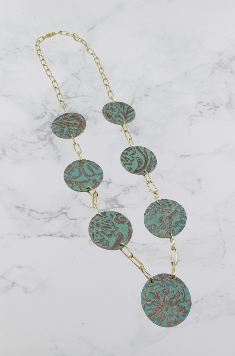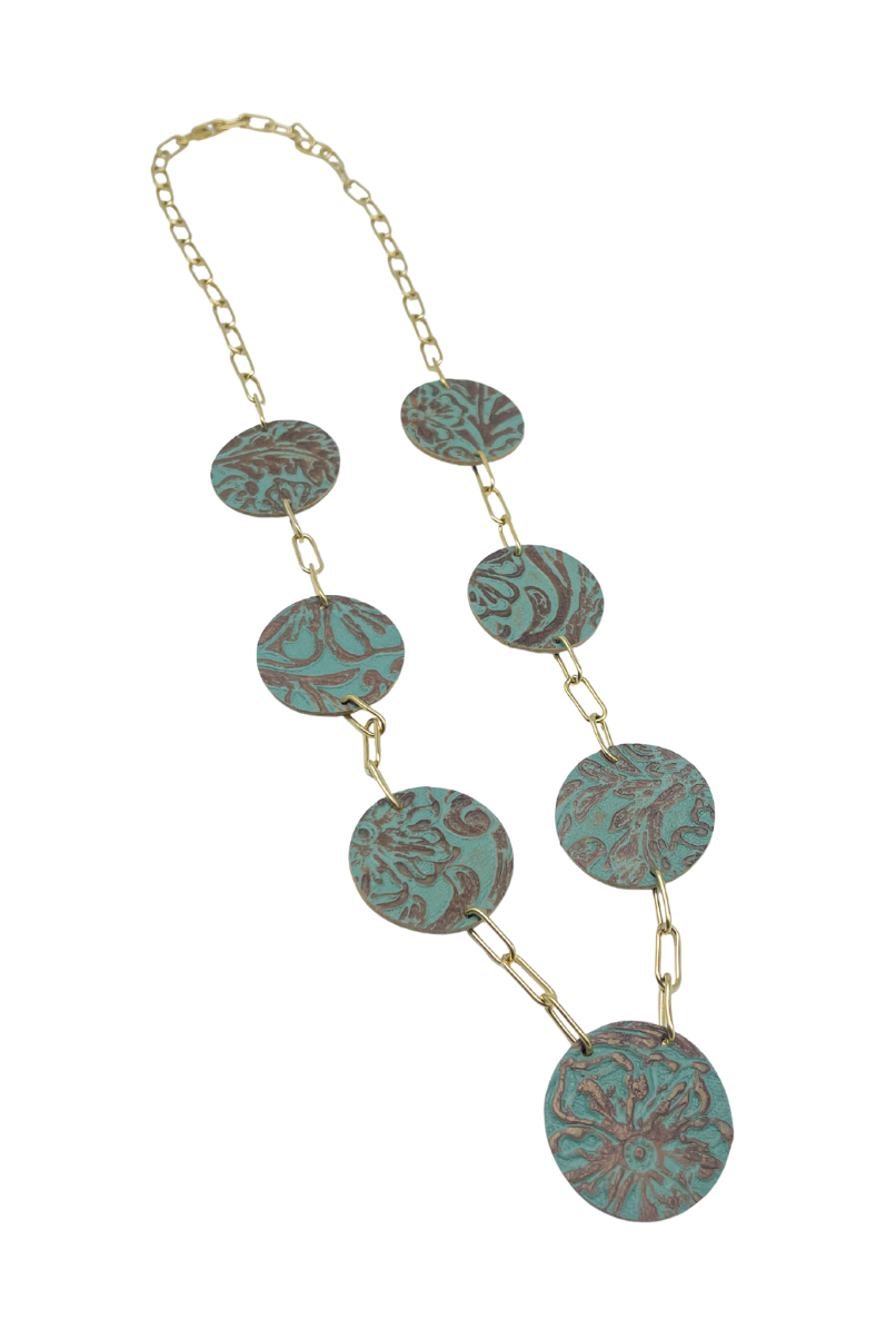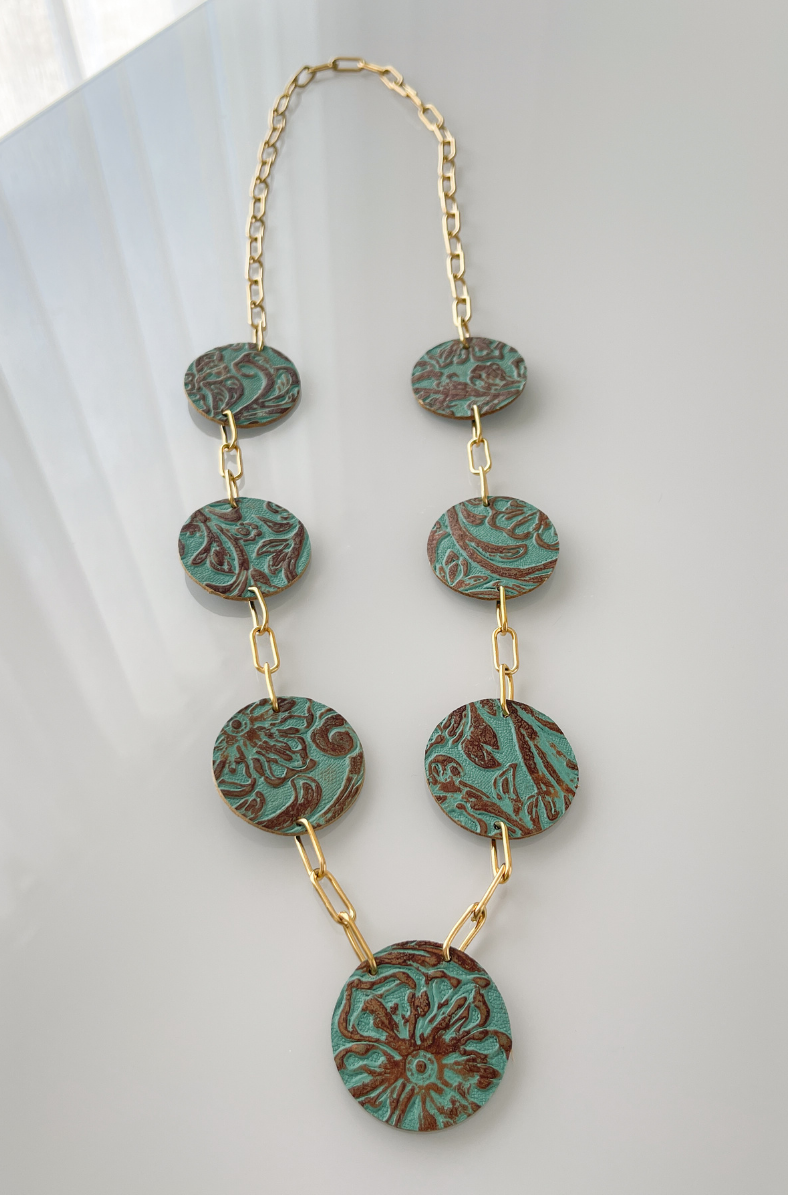 The Embossed Turquoise Leather Long Necklace features round leather discs with intricate floral embossing in rich turquoise and bronze tones. Linked by a sleek gold chain, it blends artisanal texture with modern simplicity. Lightweight and eye-catching, it adds a touch of bohemian sophistication to any minimalist look.