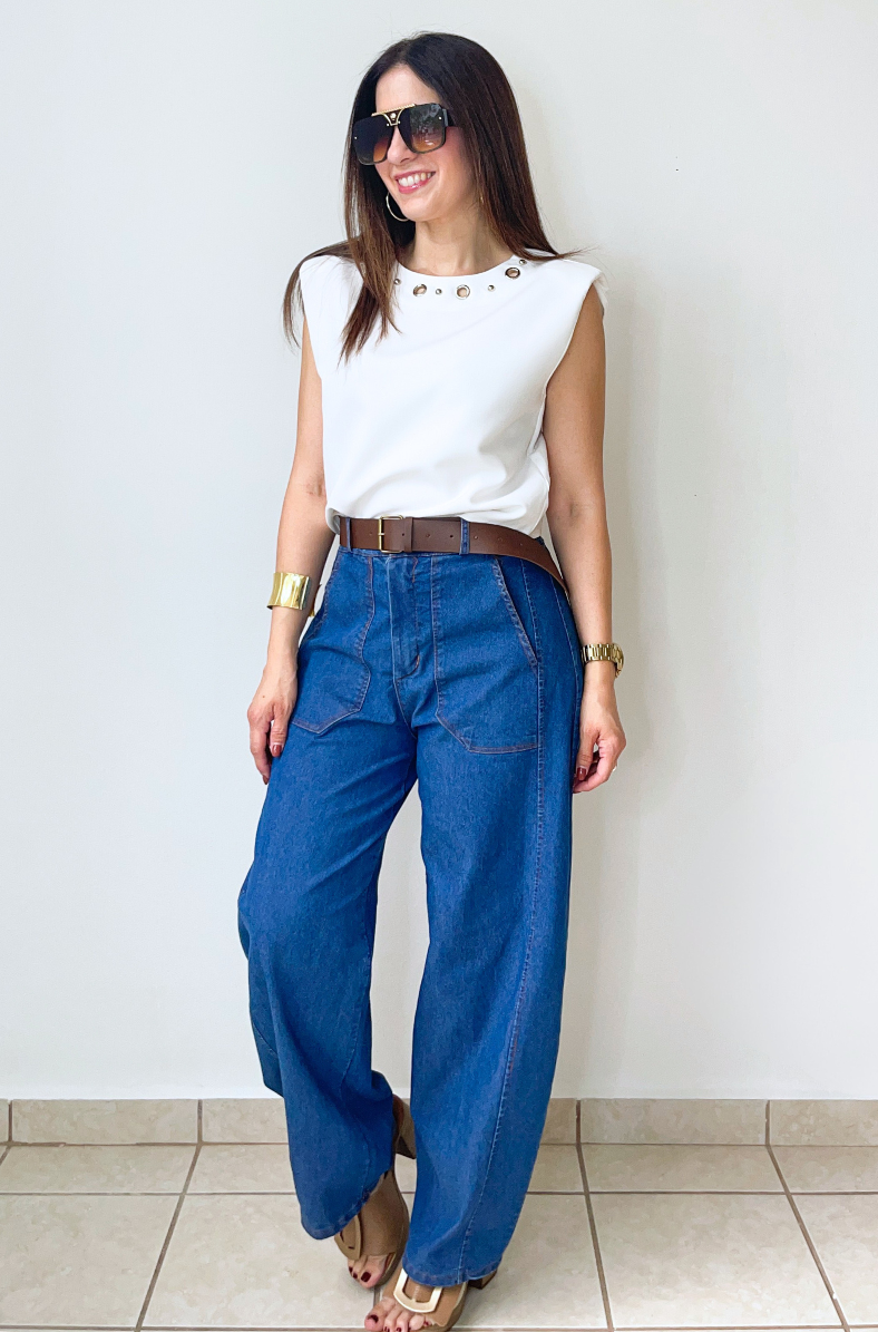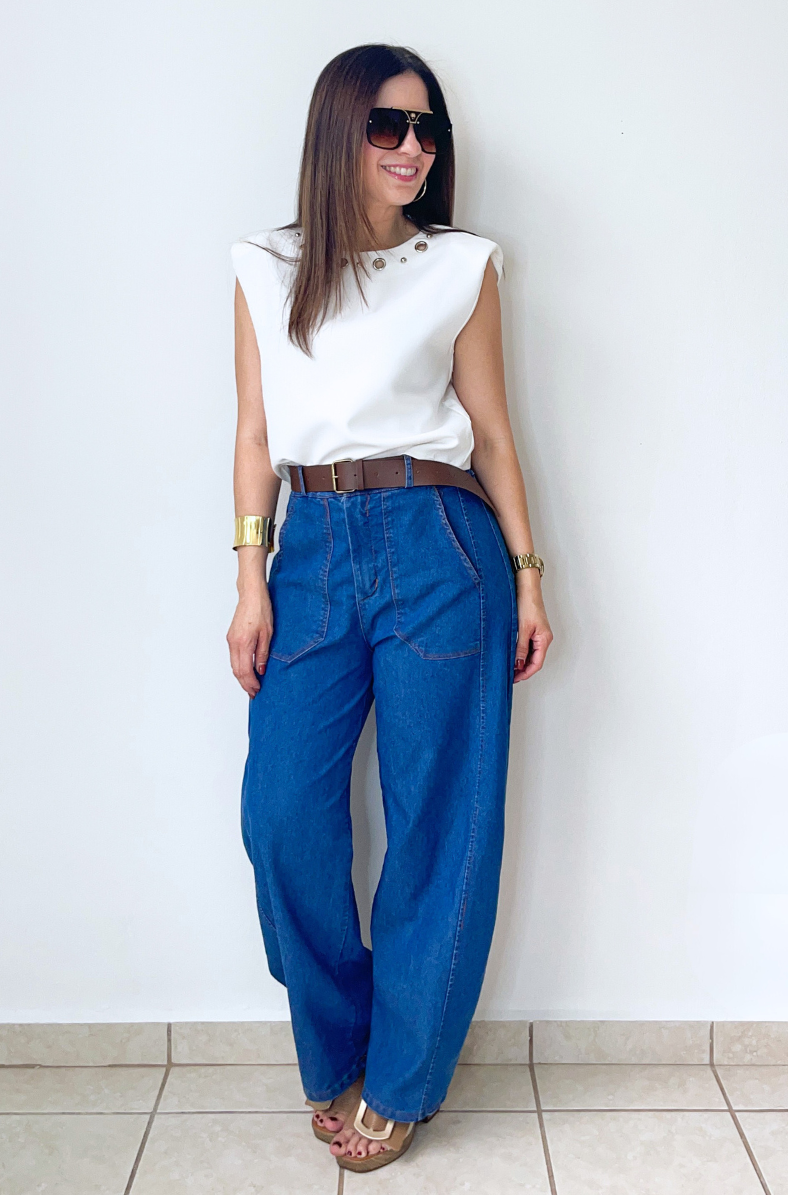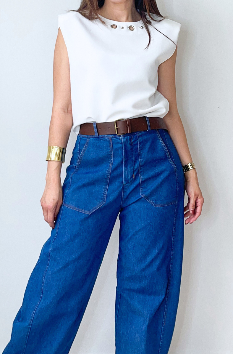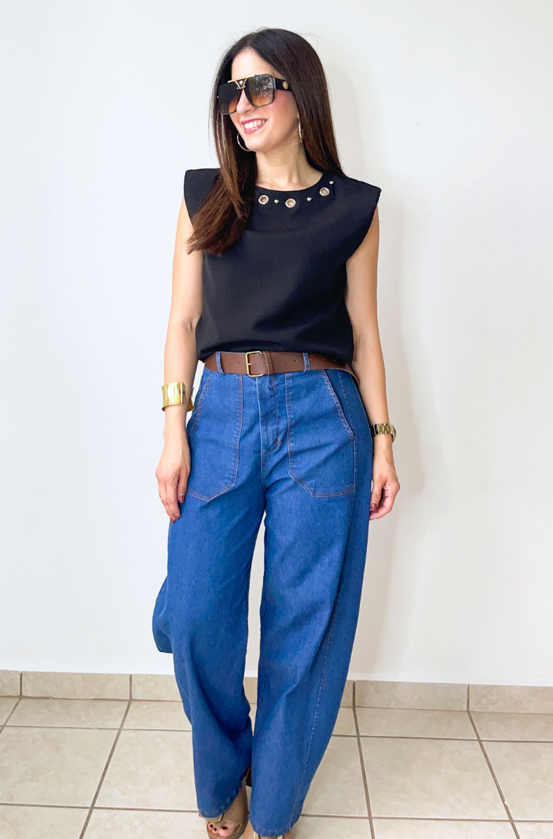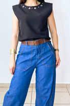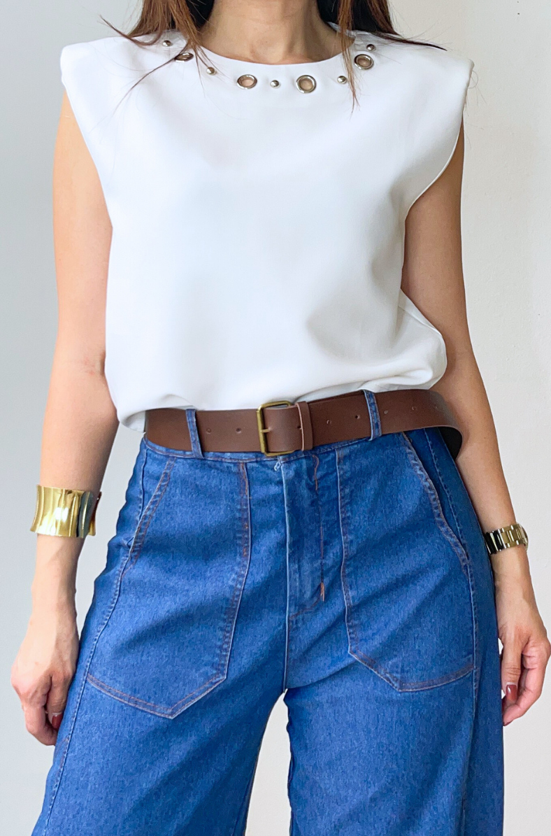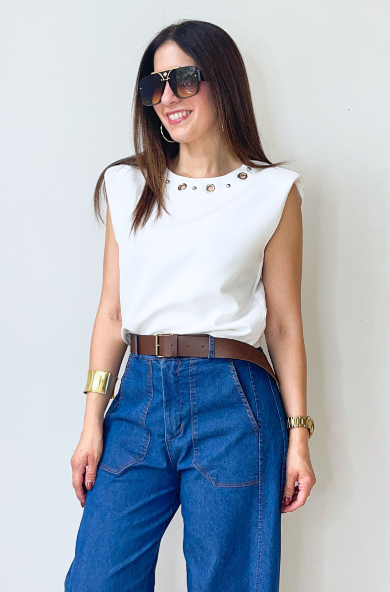 This modern sleeveless top features structured shoulder pads that create a sleek, confident silhouette. The Glam Embellished Shoulder Pads Top stands out with its metallic neckline detailing that adds a touch of bold sophistication. Perfect for transitioning from day to night, it pairs effortlessly with jeans, trousers, or skirts for a polished yet edgy look.