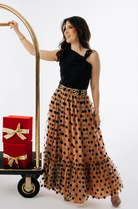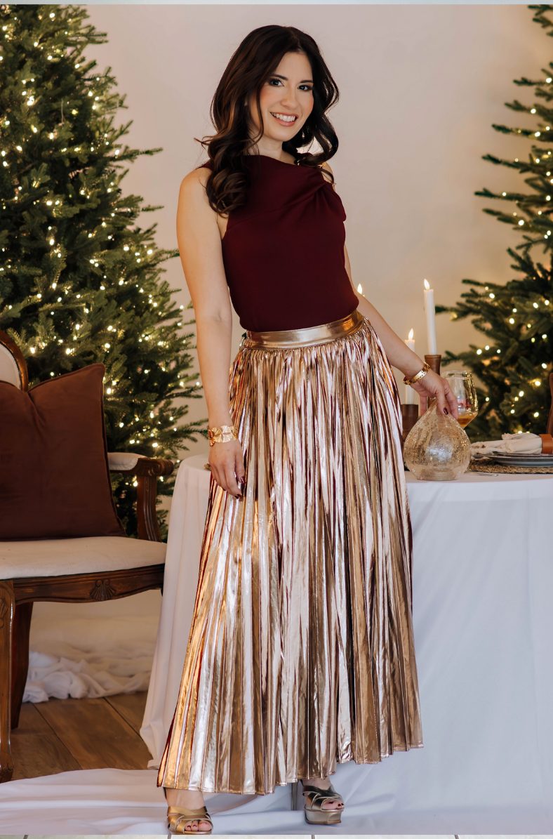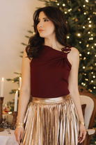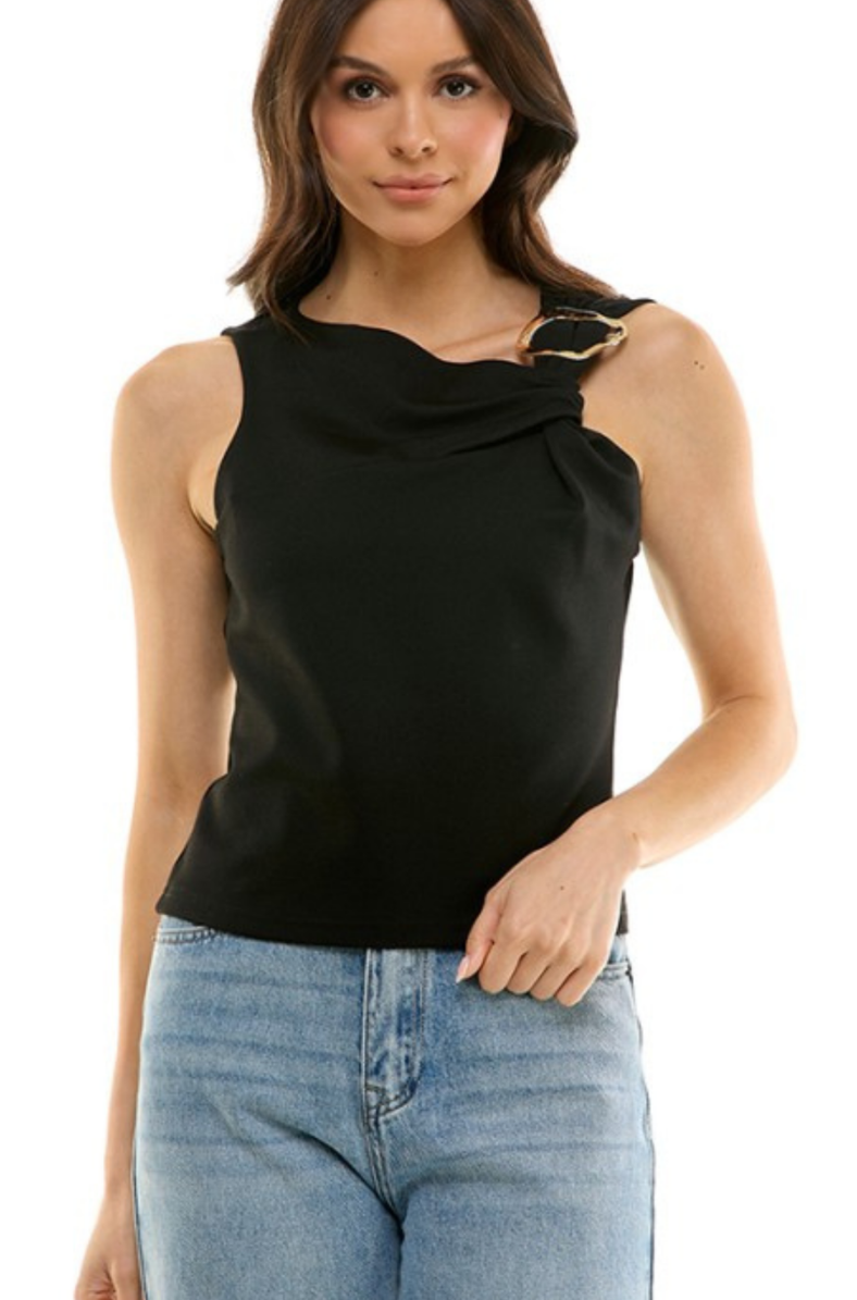 The Gold Embellishment Tank Top features a striking gold buckle detail at the shoulder, elevating its modern, asymmetrical neckline. Its smooth, structured fabric drapes beautifully for a flattering and sophisticated fit. Available in classic Black and rich Burgundy, this statement top transitions effortlessly from holiday gatherings to elegant evenings out.