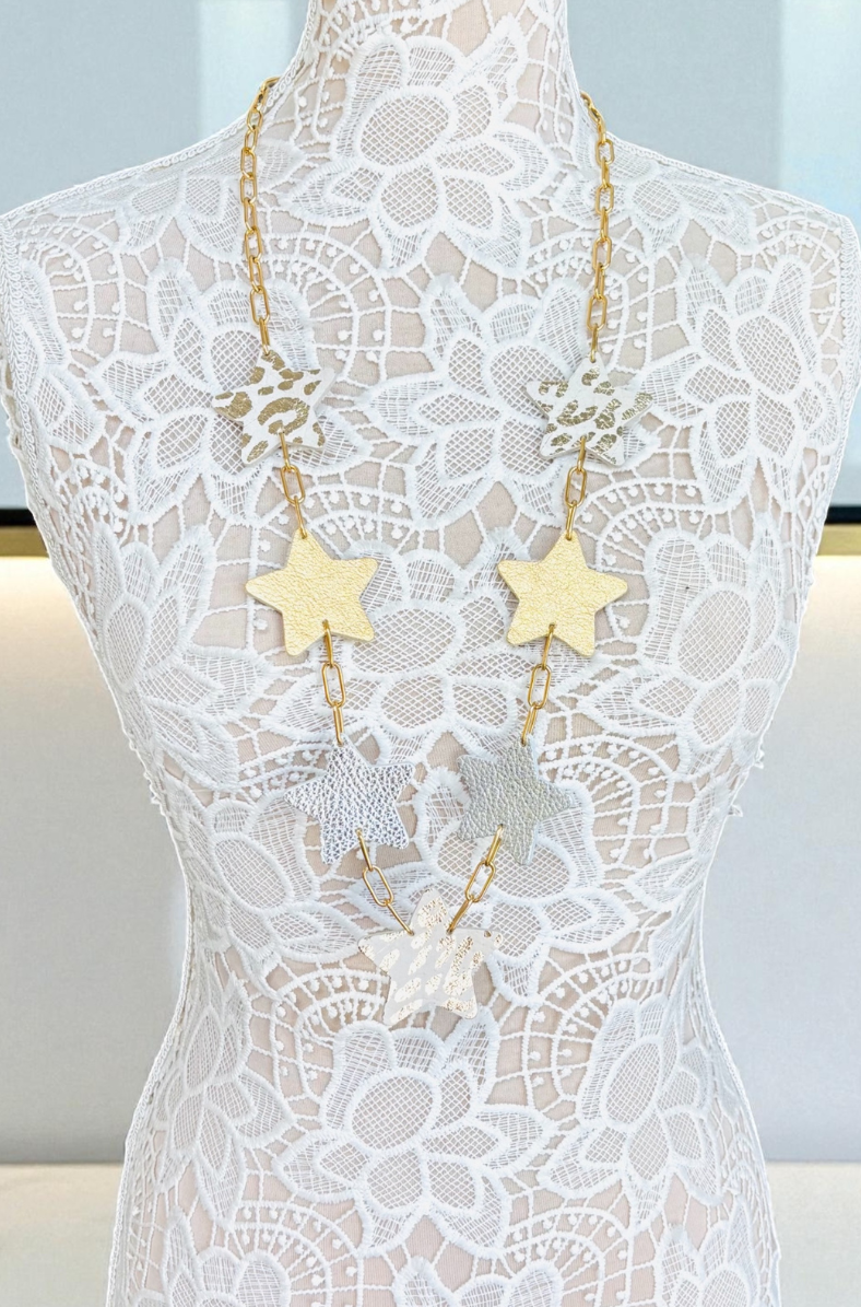 The Golden Leopard Leather Stars Long Necklace blends smooth metallic and leopard-textured leather stars for a bold yet elegant statement. Accented with a sleek gold chain, it captures a perfect balance of modern glamour and playful charm. Lightweight and versatile, it adds a touch of golden sophistication to both casual and dressy looks.