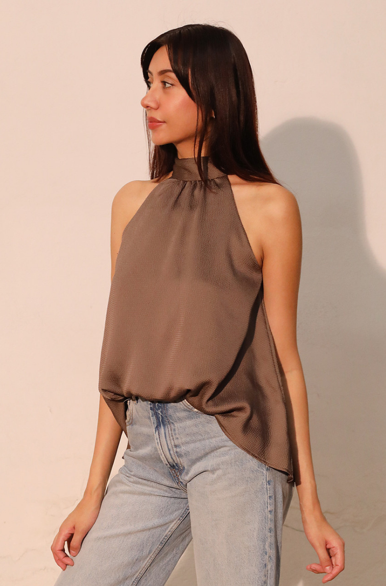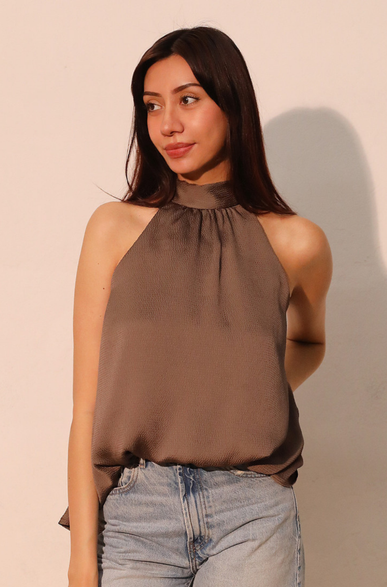 The Hammered Satin Bubble Top features a textured satin finish that catches the light beautifully, giving it a refined, modern sheen. Its halter-style neckline is designed with soft gathering and a self-tie back, offering an adjustable fit with elegant detailing. Finished with a subtle bubble hem that creates a flattering, effortless drape, this top pairs perfectly with both dressy skirts and casual denim. The soft bubble hem adds movement and a modern edge, with longer back length adding to elevated look.