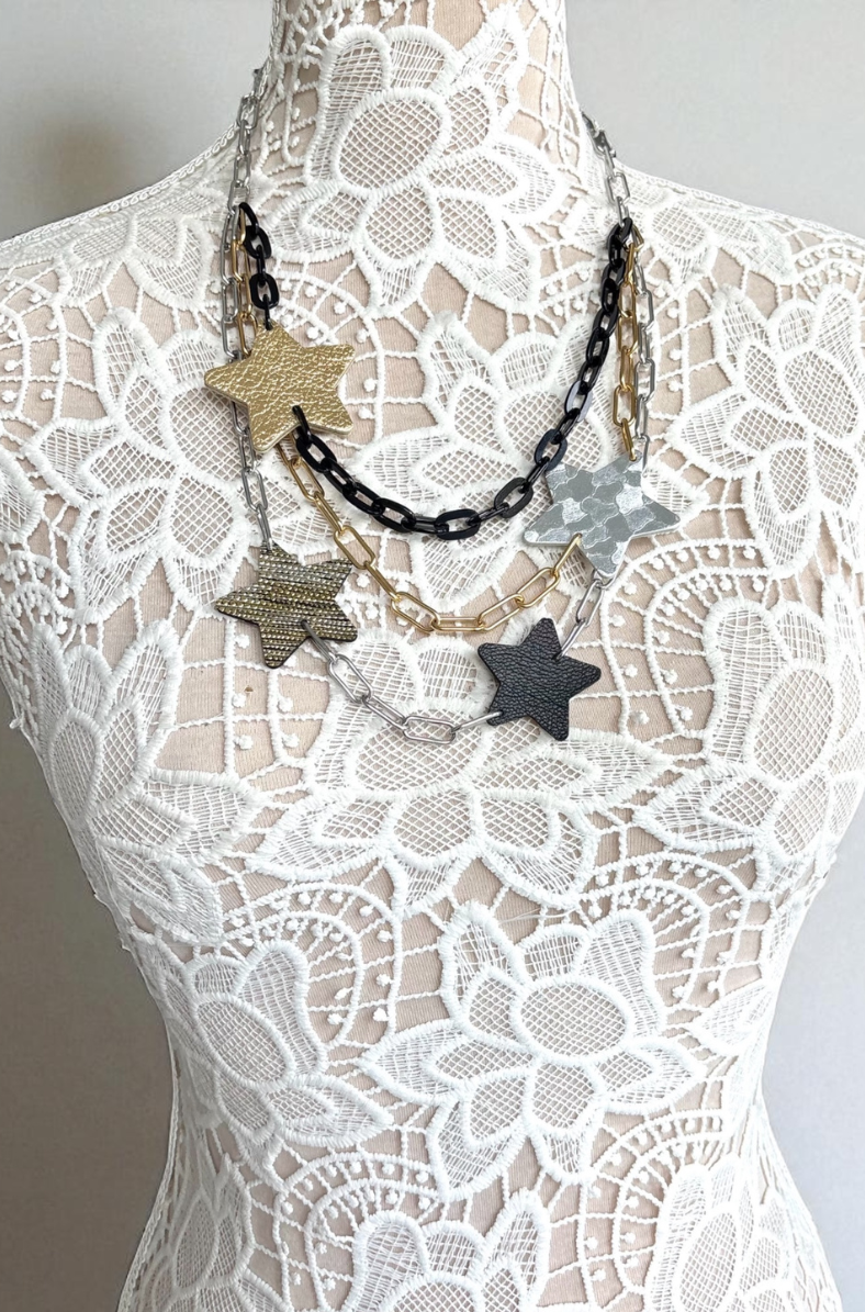 The Leather Stars Chain Statement Necklace is a bold accessory featuring layered mixed-metal chains adorned with star pendants. Its blend of gold, silver, and black tones adds a modern edge while keeping it versatile for both casual and evening looks. Perfect for elevating simple tops or dresses, this necklace brings a playful yet polished sparkle to any outfit.