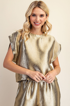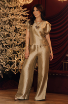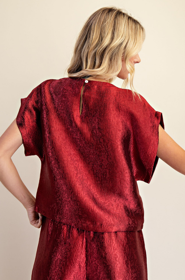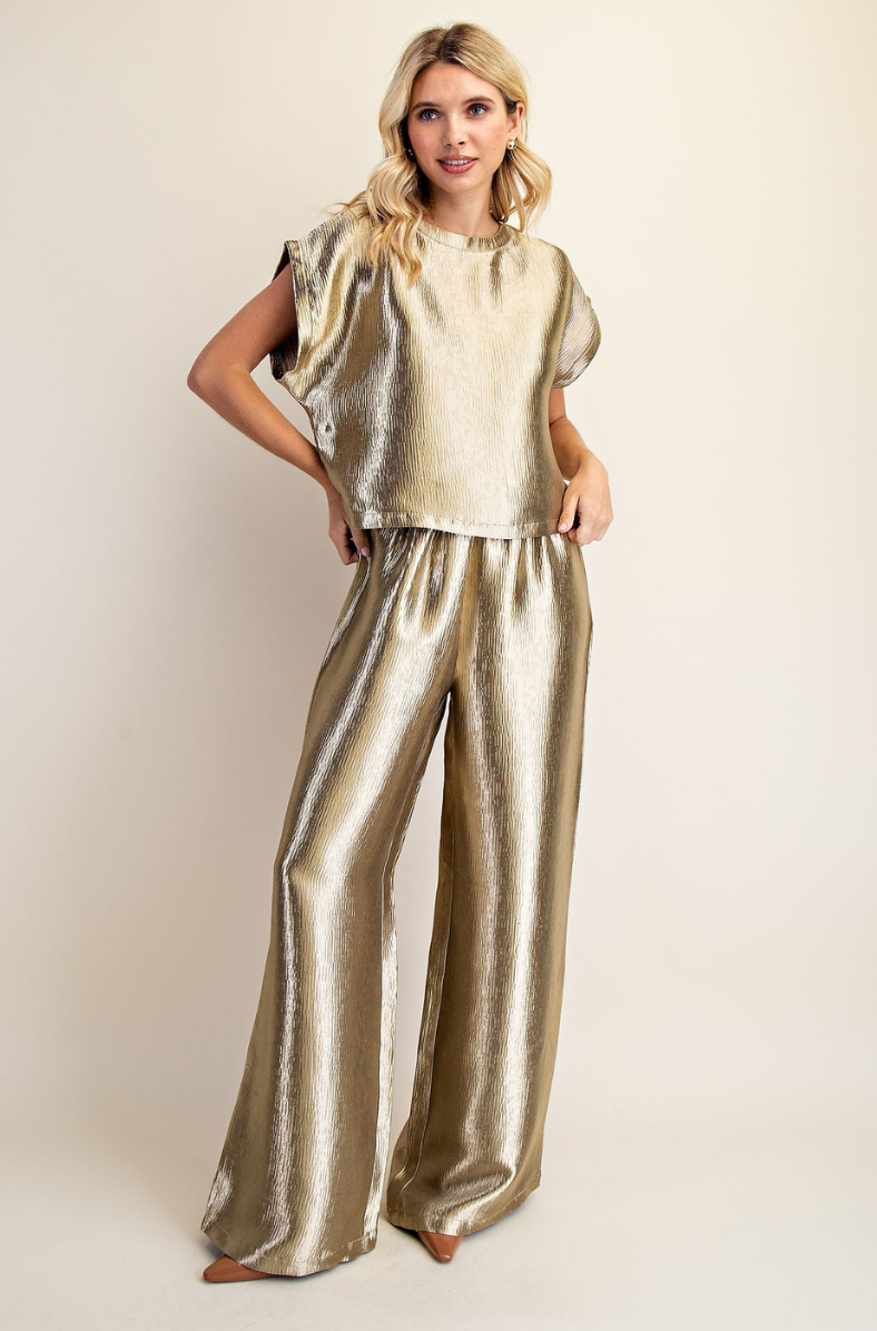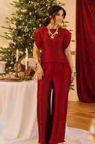 The Luminous Texture Top & Pants Set features a beautifully textured satin-like fabric that catches the light with every movement, offering an elegant and festive glow. The relaxed cap-sleeve top pairs effortlessly with the matching wide-leg pants for a coordinated, elevated look. Designed for comfort, the pants include a flexible elastic waistband, making this set perfect for holiday gatherings, special events, or any occasion where style meets ease.