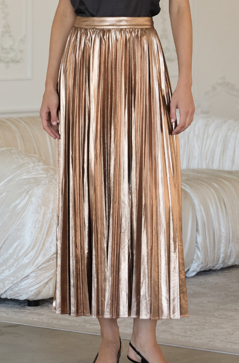 The Pleated Gold Metallic Maxi Skirt features a stunning high-shine finish with crisp pleats that create elegant movement and eye-catching dimension. Its flowy silhouette is complemented by a comfortable back elastic waistband that offers an easy, flexible fit. Perfect for holiday parties, evening events, or any special occasion, this radiant skirt instantly elevates any look with glamorous sparkle.