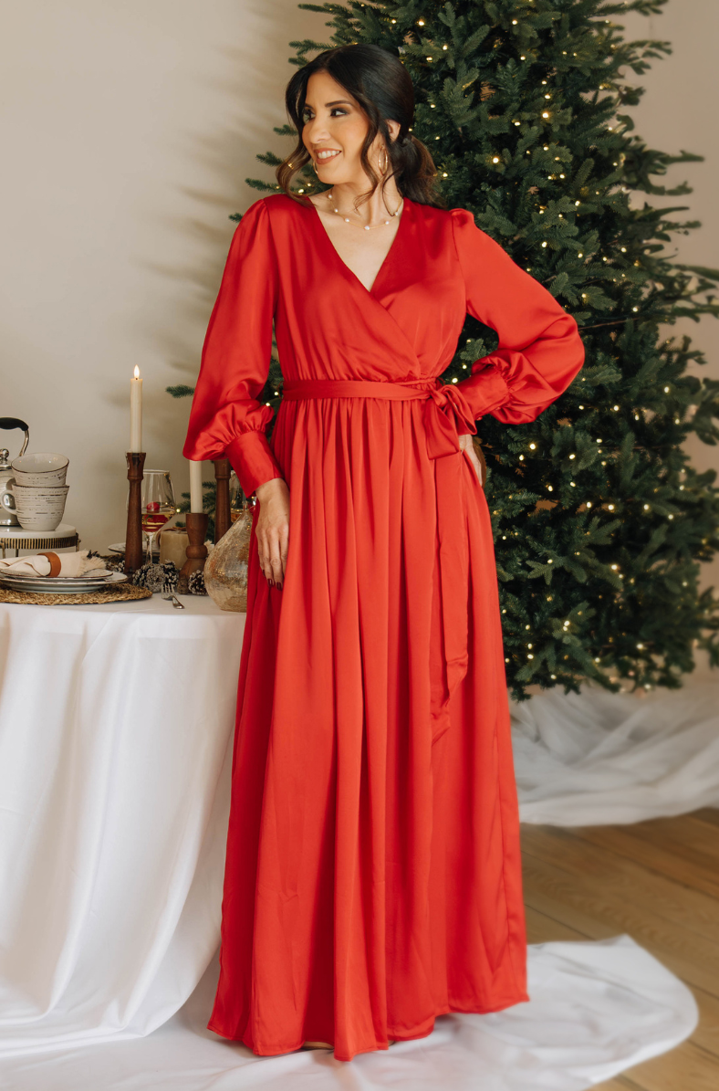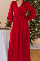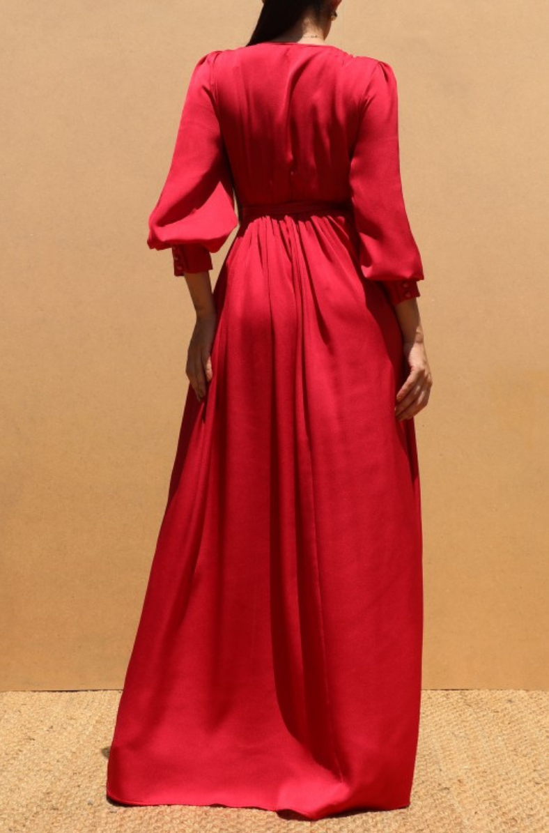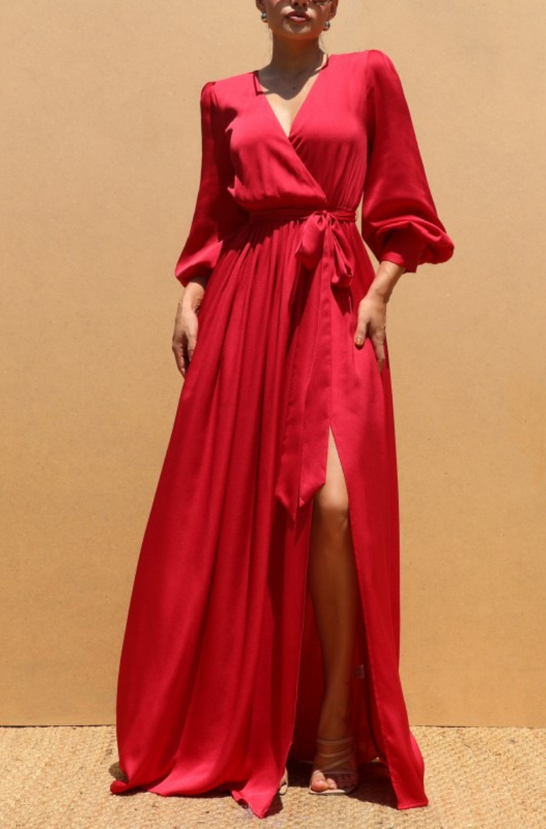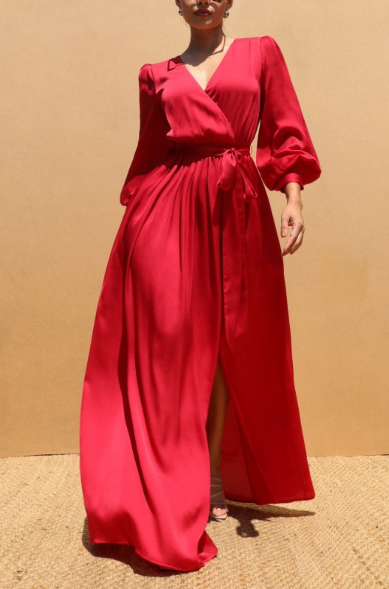This satin maxi dress features a flattering V-neckline and elegant puff sleeves finished with delicate buttoned cuffs. Its flowing silhouette includes a subtle slit for ease of movement and a touch of sophistication. Complete with a self-tie waist that enhances your shape, this dress is perfect for special occasions and festive celebrations. It features lining on the bodice area.