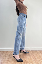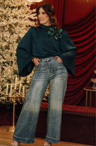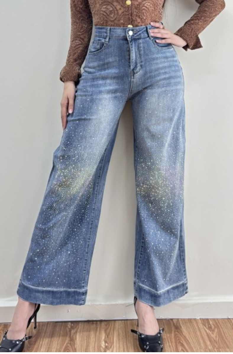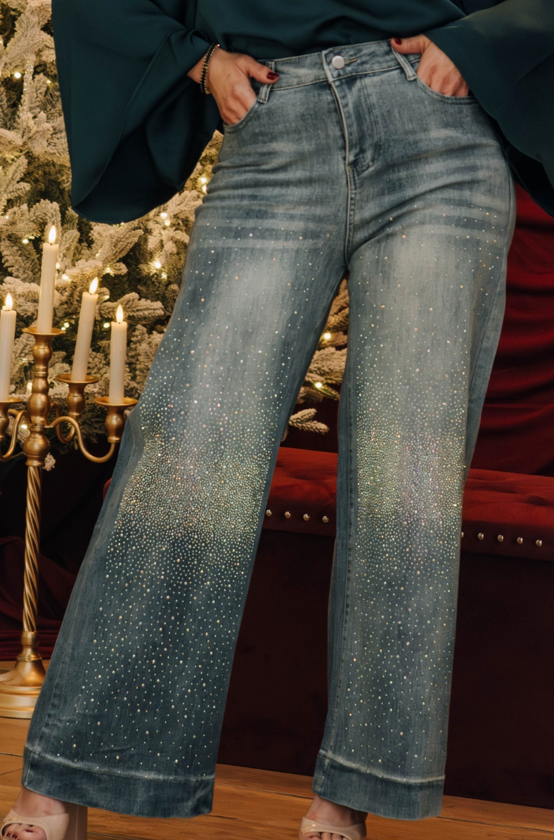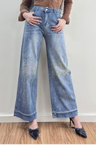 The Shimmer Dust Light Wash Denim features a soft, comfortable fabric that drapes beautifully while maintaining a flattering shape. Scattered crystal detailing creates a radiant, shimmering effect along the legs, giving these wide-leg jeans a glamorous, eye-catching finish. With their high-waisted silhouette and ultra-soft denim, this pair blends everyday ease with standout sparkle for any occasion.
