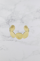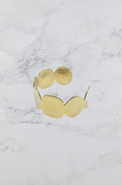 The Solara Cuff radiates effortless elegance with its softly hammered texture and luminous golden sheen. Crafted from stainless steel and 18K gold-plated, it offers both durability and refined sophistication. Adjustable for a perfect fit, this timeless piece adds a warm, sun-kissed glow to any look, day or night.