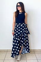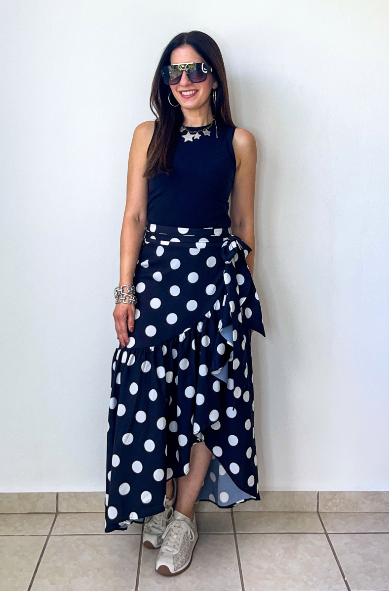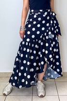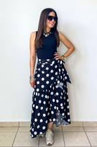 Our whimsicial Wrap Around Midi Skirt features a timeless black base with bold white polka dots, blending classic charm with modern flair. The adjustable wrap design allows it to be tied at the side, front, or back for versatile styling. A ruffled hem adds graceful movement, making it perfect for both casual daytime wear and chic evening outings.