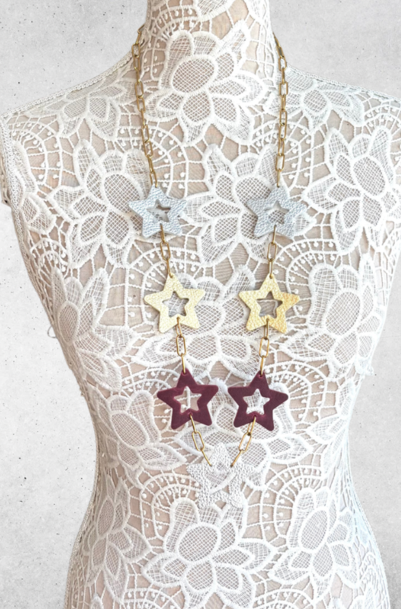 The Soft Glow Leather Stars Necklace features layered leather star charms in warm, elegant tones paired with delicate gold-link chains. Its subtle shimmer and rich color mix create a refined statement that feels both feminine and timeless. Perfect for elevating everyday looks or complementing dressier outfits with a soft, glowing finish.