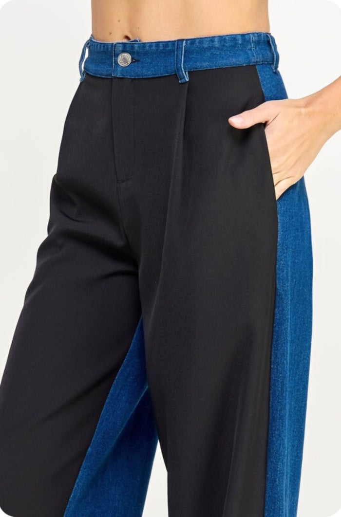 These Suiting Contrast Denim Straight Leg Trousers offer a stylish and versatile addition to any wardrobe. These trousers offer a sleek and casual chic look. The contrasting detail adds a modern touch, making it a perfect choice for any occasion. These pants feature a combination of stretch suiting fabric and denim fabric, straight leg style, belt loops, side pockets, welt back pockets, front pleat, mixed media fabrication, and zipper fly with button closure.