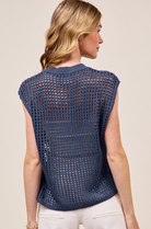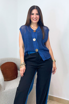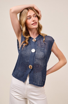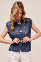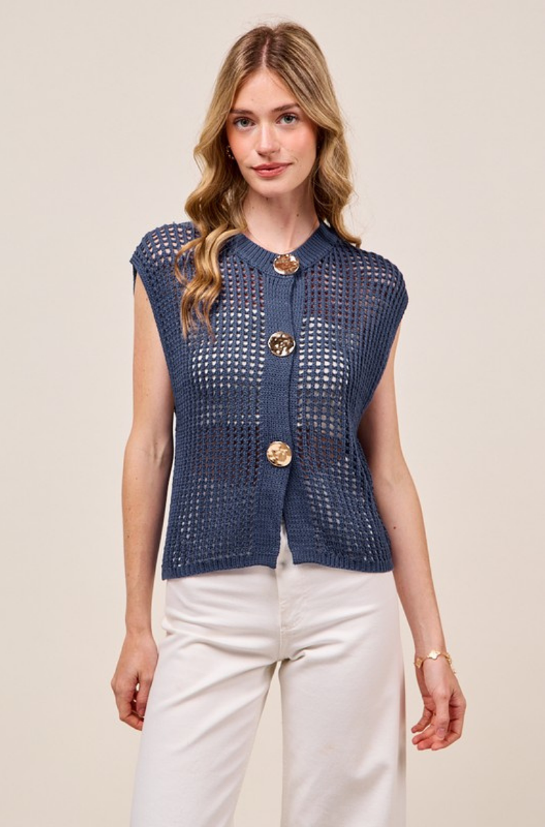 The Gold Metal Button Sweater Vest Top is a chic layering piece featuring oversized gold-tone buttons that add a touch of elegance. Its open-knit design gives it a breezy, modern look, and the true color is a darker blue than it appears in the pictures, making it even more versatile and rich in tone. Perfect over a tee or styled alone, this vest brings effortless sophistication to both casual and smart-casual outfits.