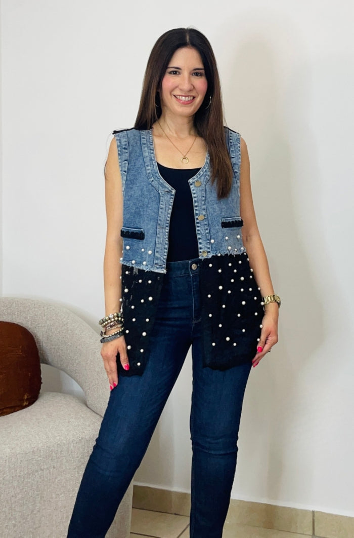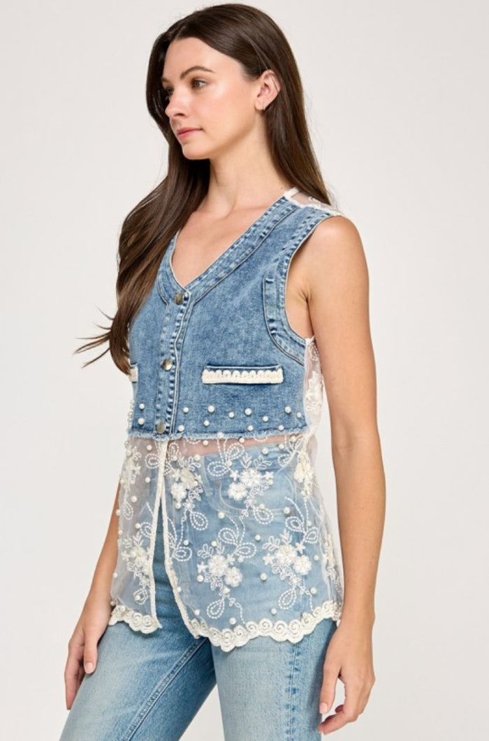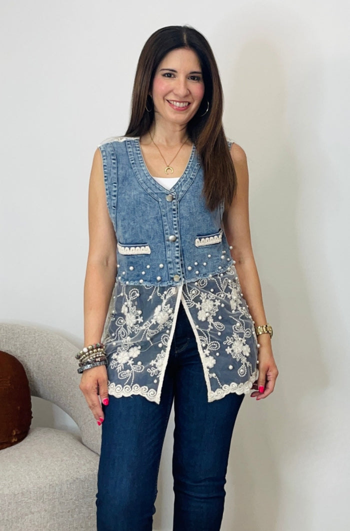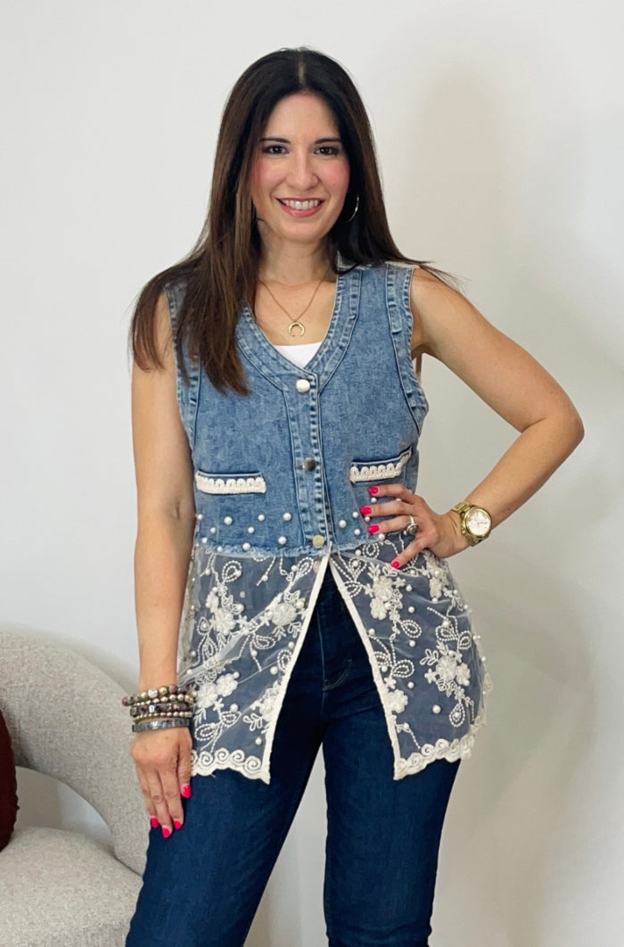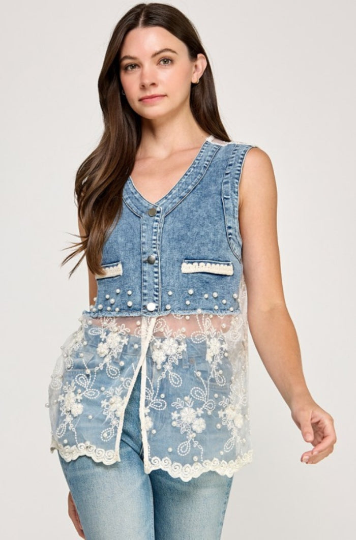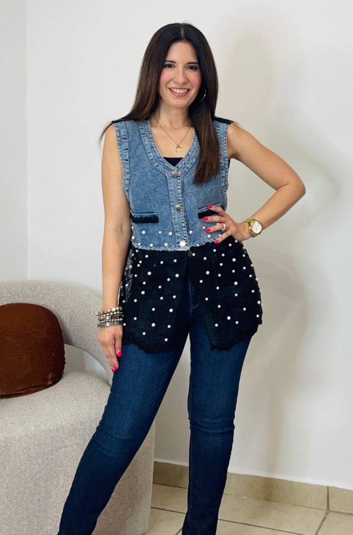 This Sleeveless Denim & Lace Top blends edgy denim with delicate lace for a chic, feminine twist. Adorned with pearl accents and intricate detailing, it’s a standout piece that elevates any outfit. Available in classic white or bold black, it’s perfect for adding effortless glamour to your look. This top features button down style, non-functional pockets, lace, pearls & rhinestones details.