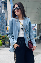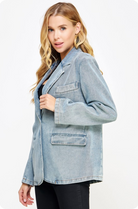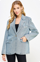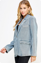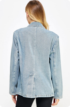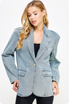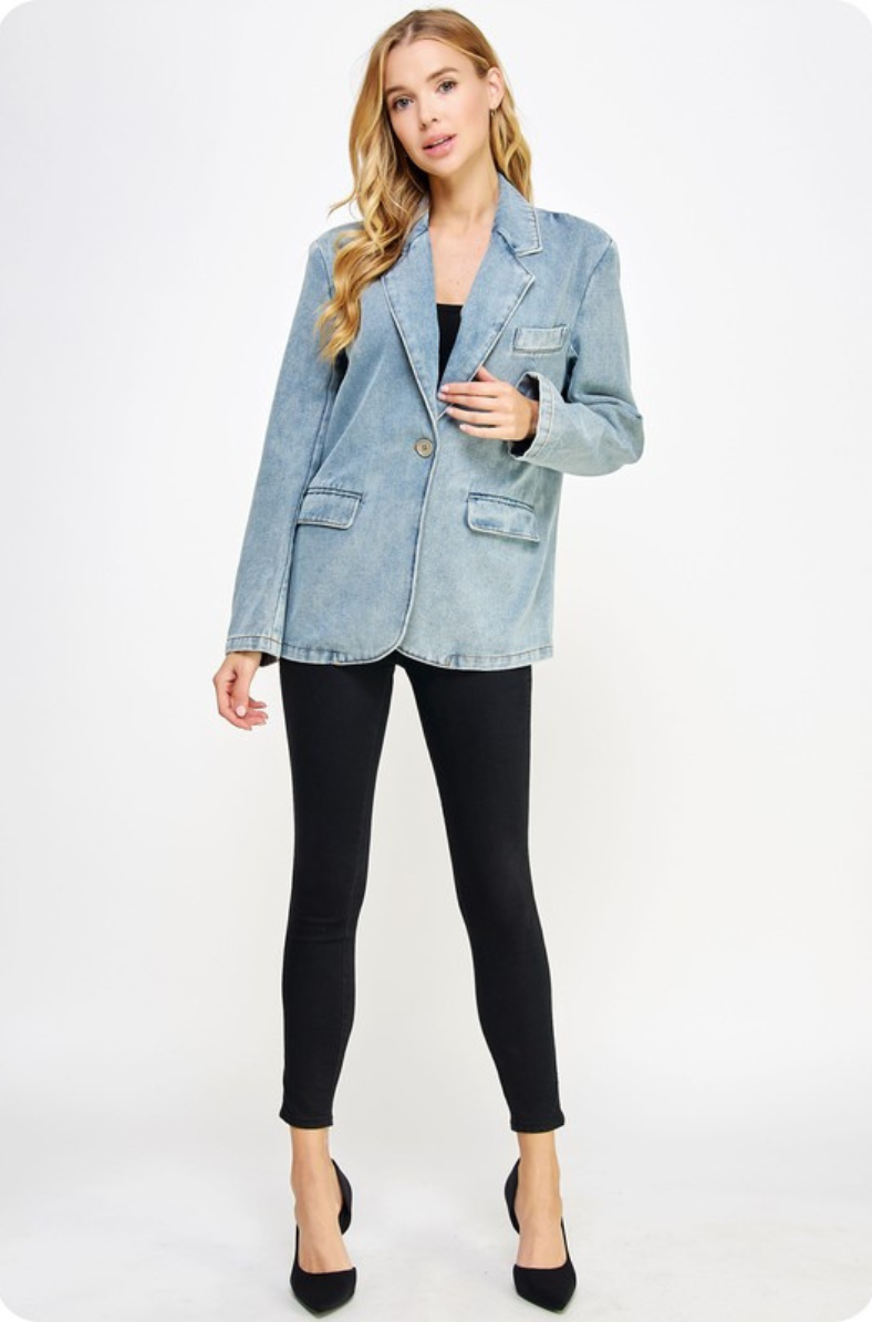 The Washed Denim Blazer offers an effortlessly chic take on a timeless silhouette. Designed with a relaxed, loose fit, shoulder pads and functional pockets, it combines everyday ease with polished tailoring. Its soft washed denim finish brings a modern, laid-back edge, making it perfect for pairing with everything from trousers to dresses.