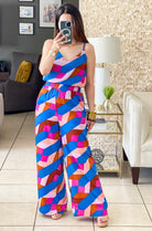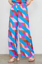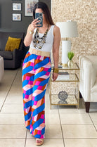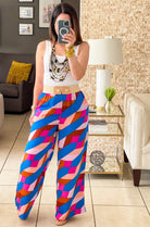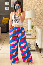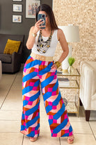 Introducing our new Bold Geo Print Wide Leg Pants! Add a pop of pattern to your wardrobe with these stylish pants. The wide leg design offers a comfortable and flattering fit, while the bold print makes a statement. Elevate your style with these must-have pants! These pants feature a high-waist fit, an elastic waistband and side pockets.