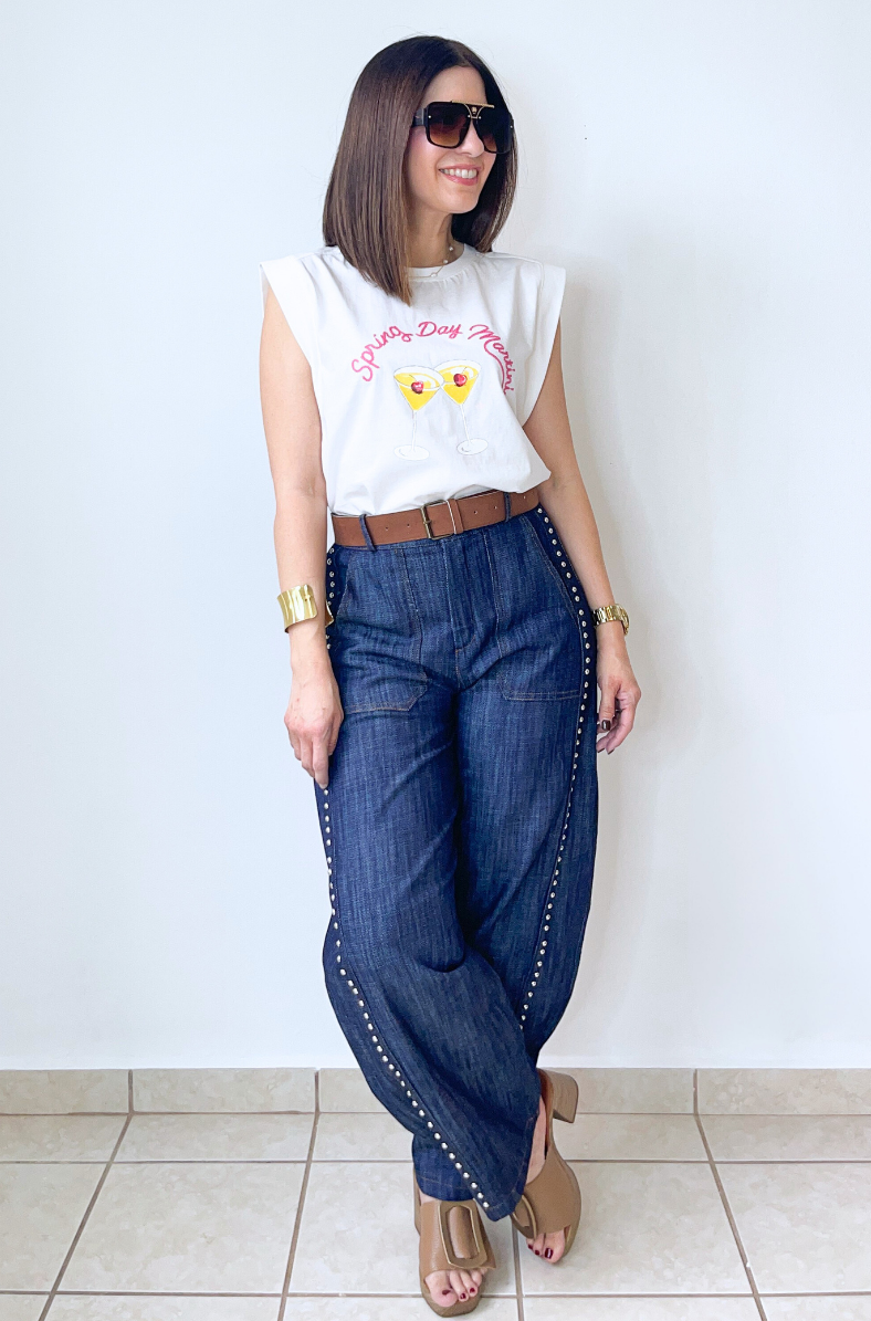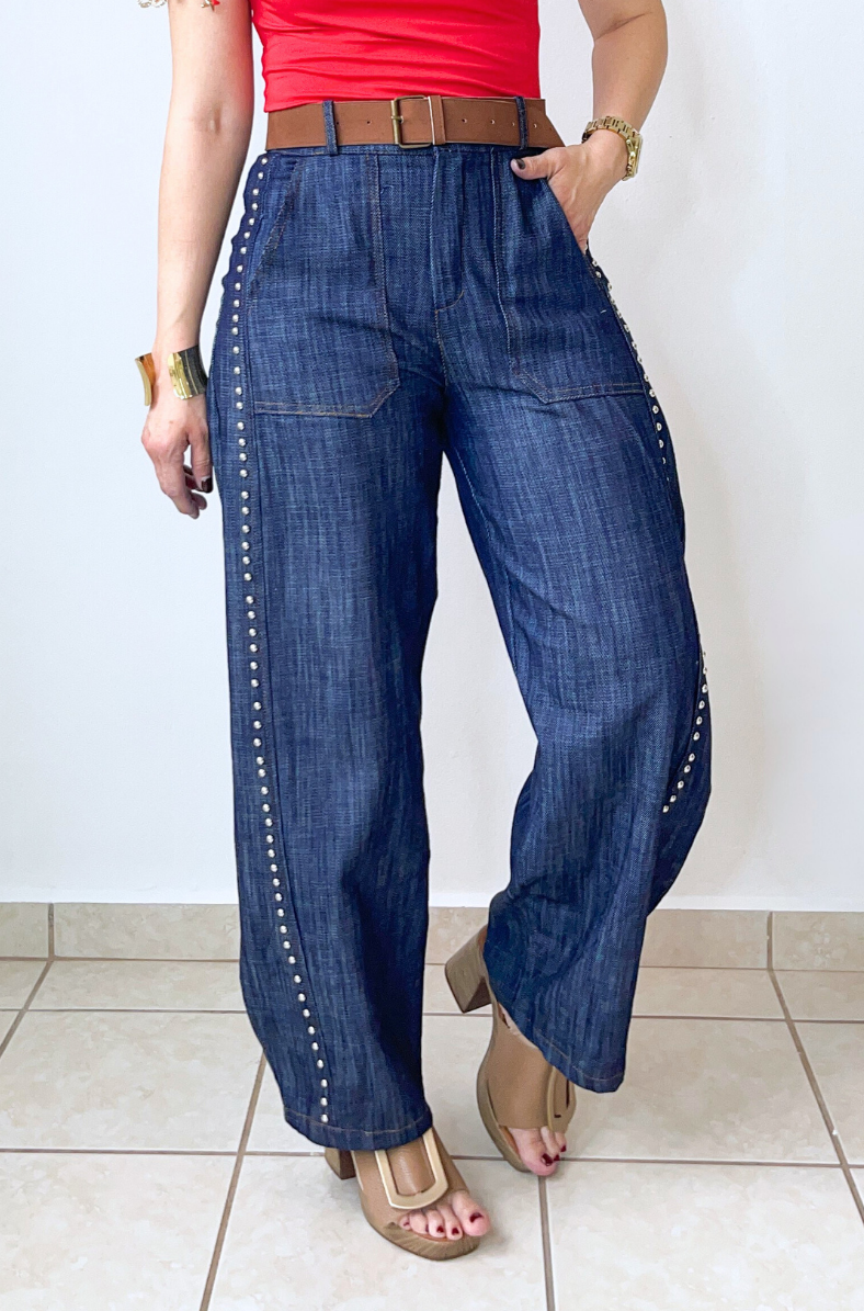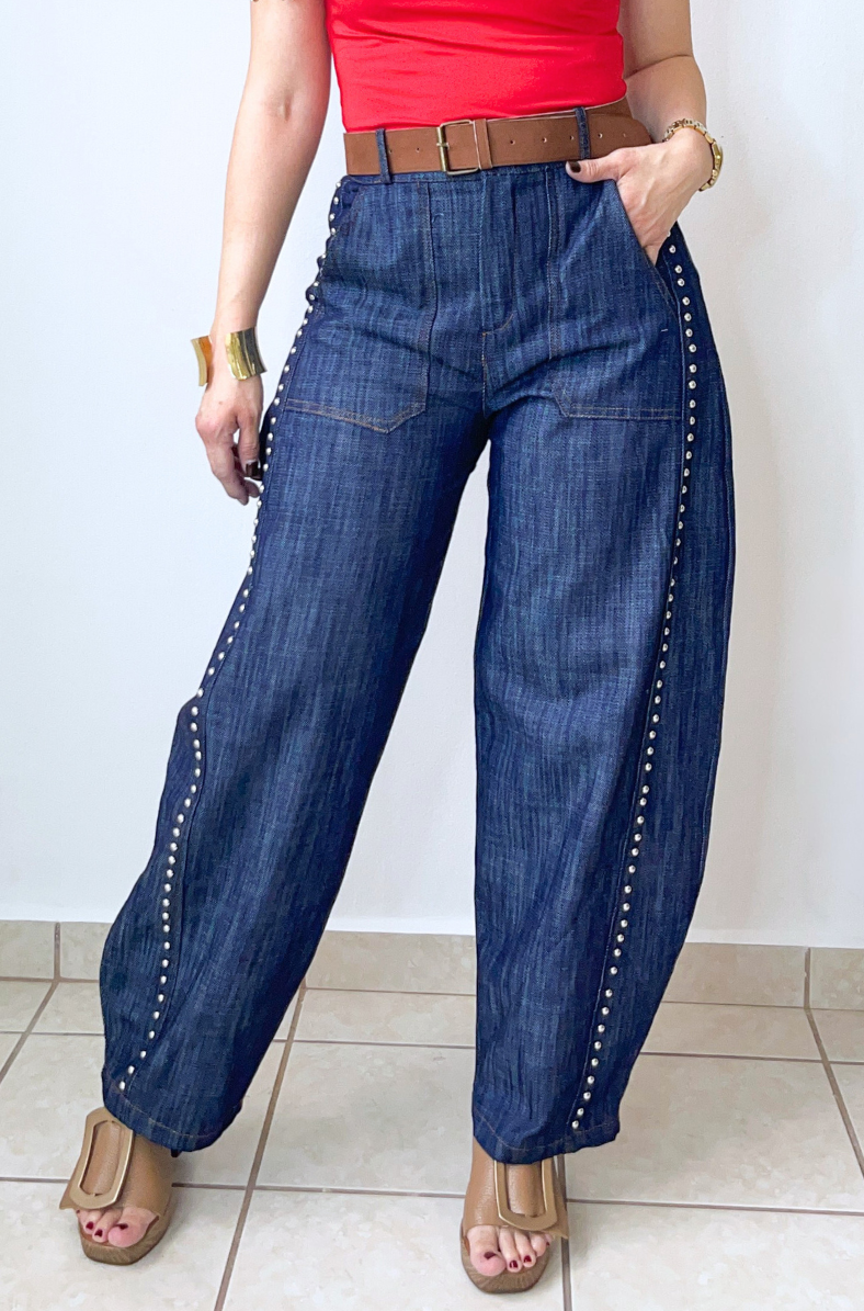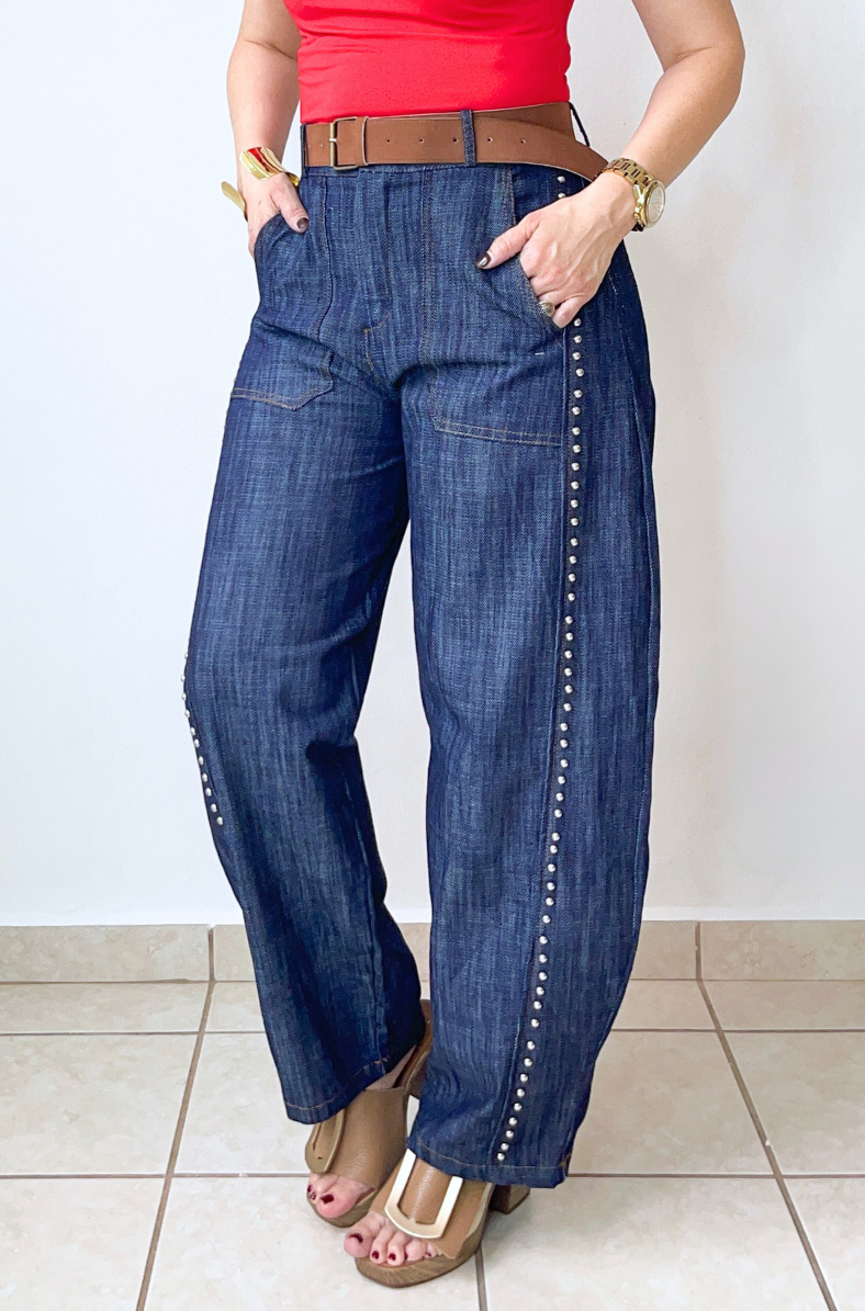 The Studded Barrel Jeans feature functional front pockets, wide belt loop waist with a contrasting belt, and a line of metal stud detailing running down the outer seams.