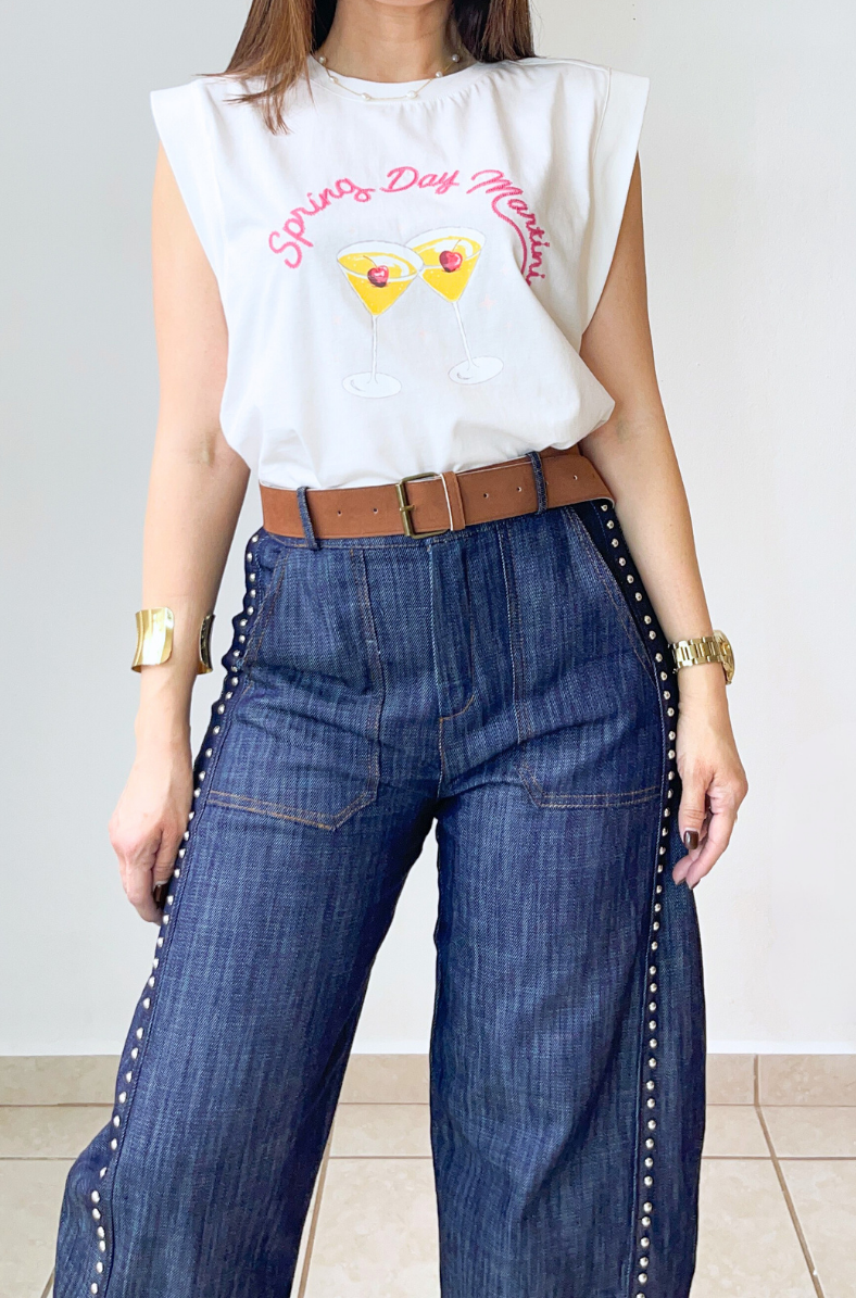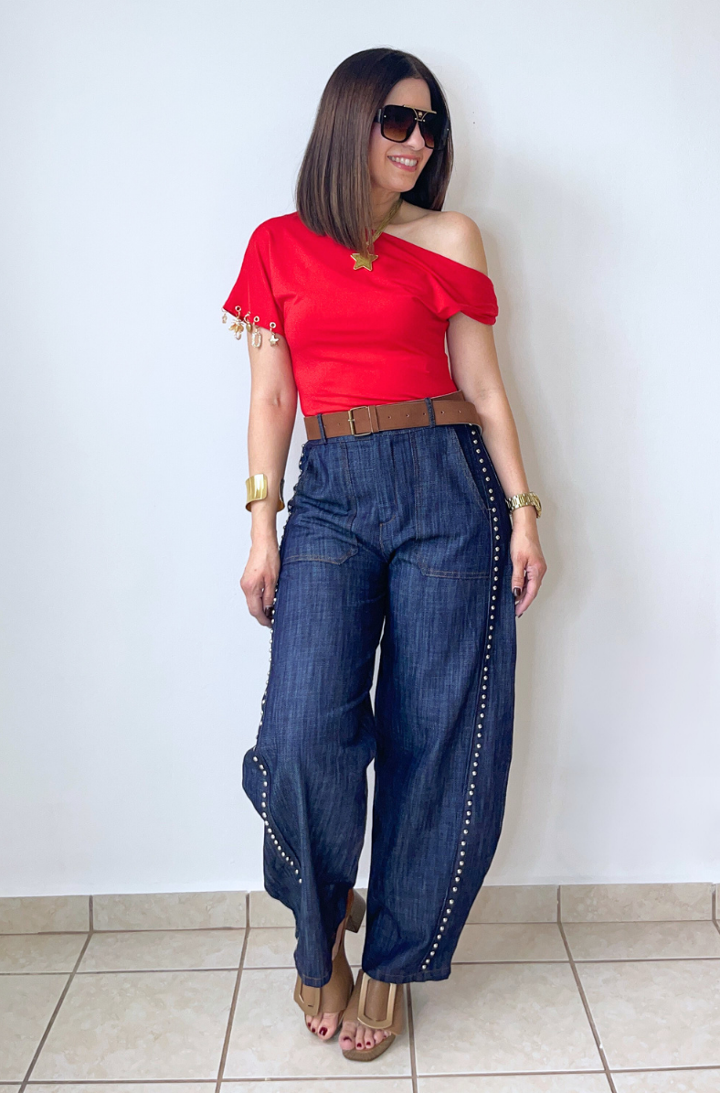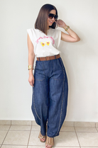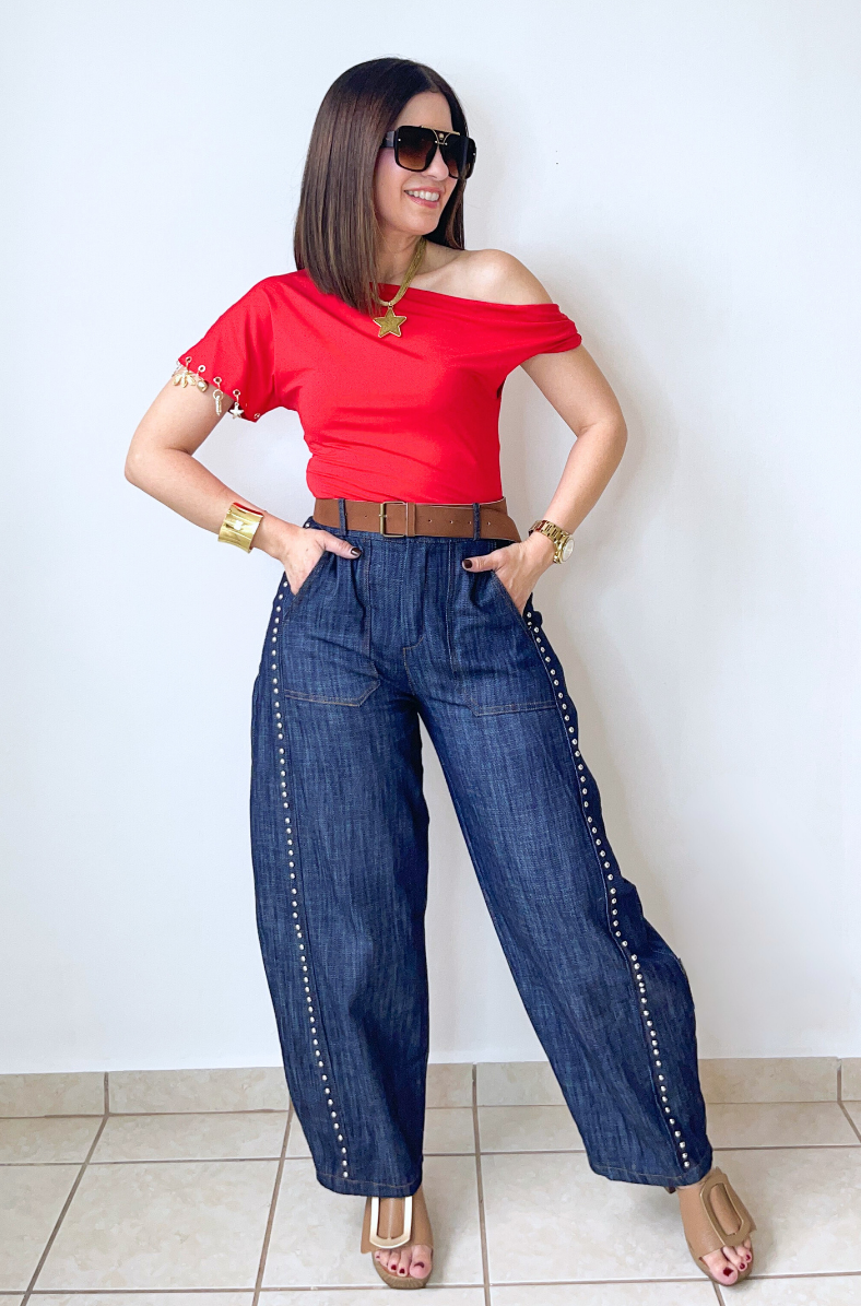 The Studded Barrel Jeans feature functional front pockets, wide belt loop waist with a contrasting belt, and a line of metal stud detailing running down the outer seams.